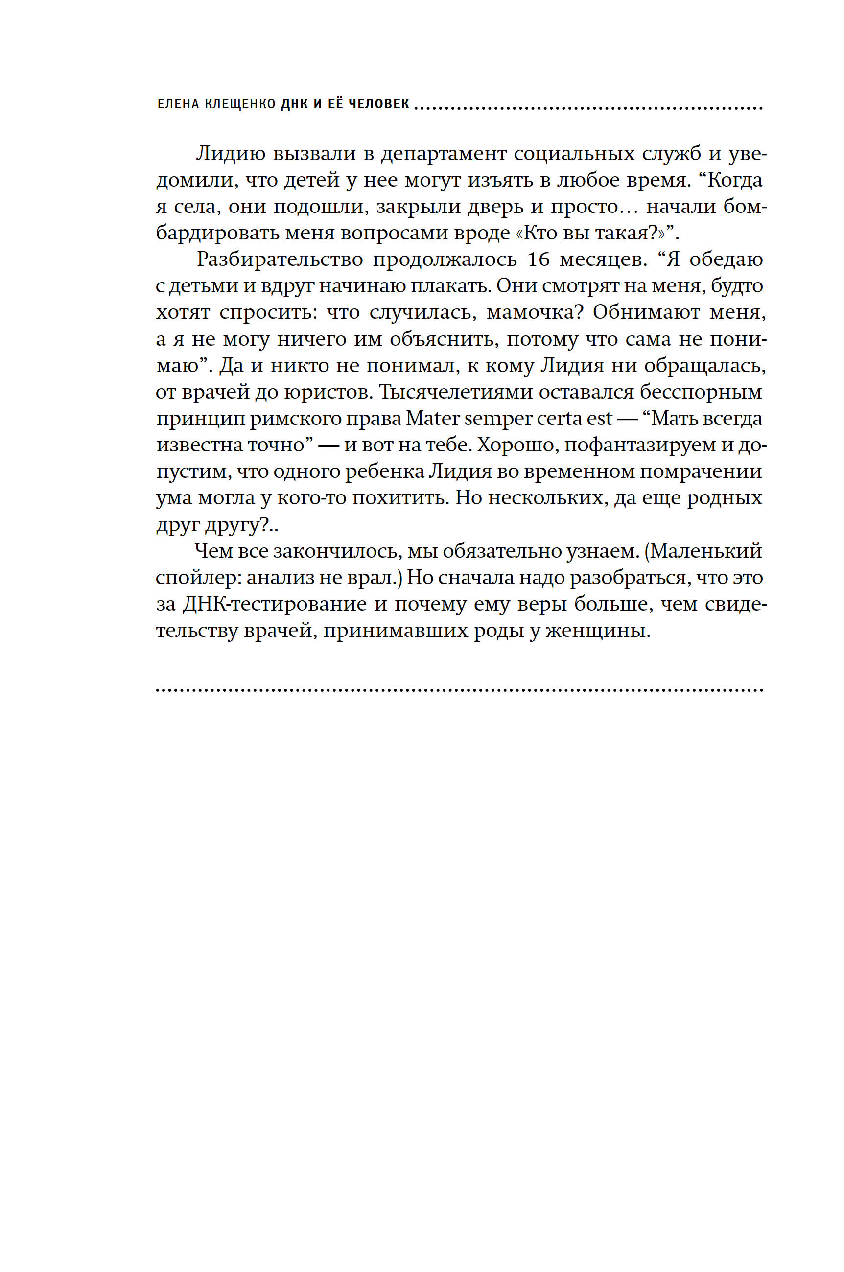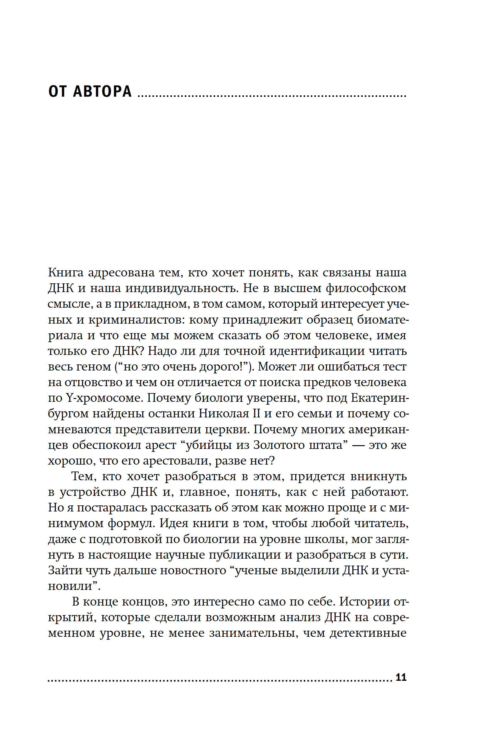 Книга Елены Клещенко адресована тем, кто хочет узнать больше о применении генетических технологий в различных областях, таких как криминалистика, генеалогия и история. В ней рассказывается о возможности идентификации человека по его генетическому материалу.