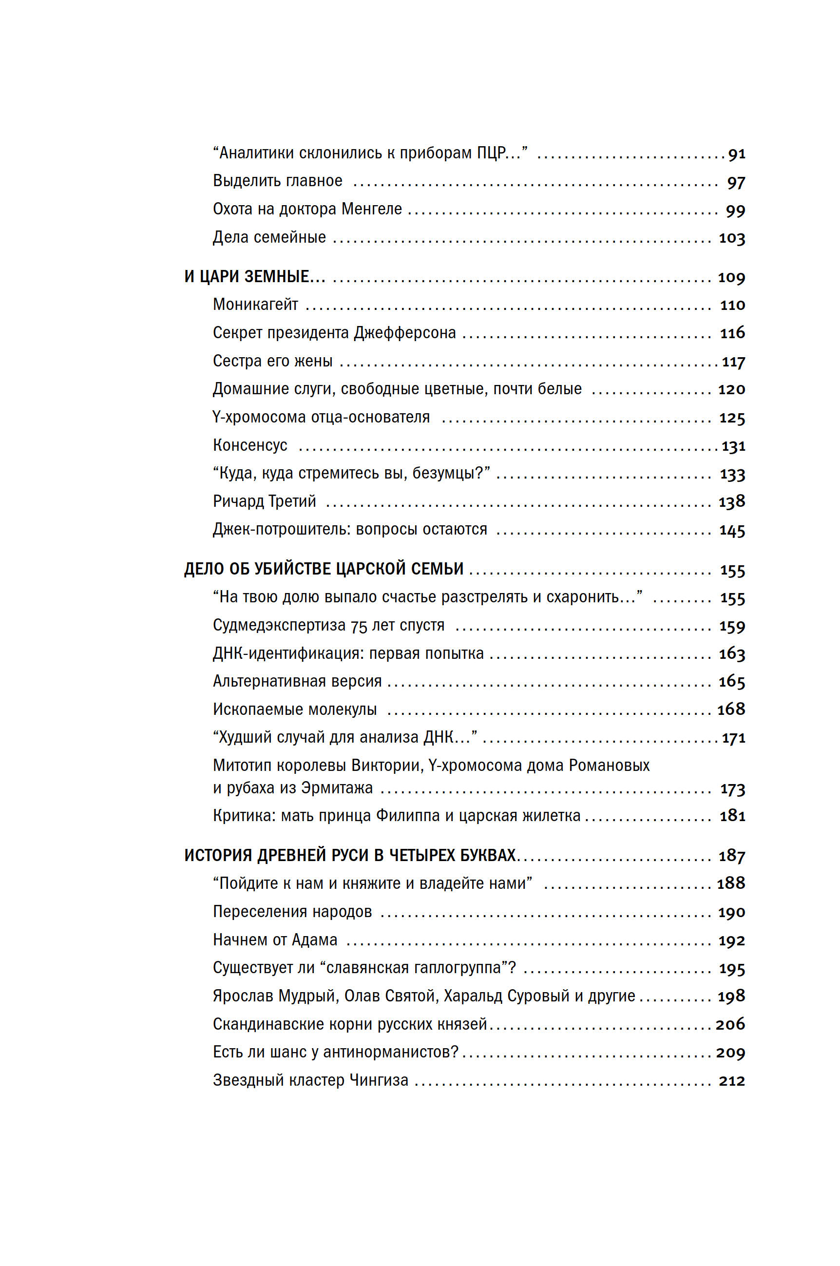 Автор также рассказывает об исторических расследованиях, таких как определение этнической принадлежности Рюрика, потомки Чингисхана и родственные связи герцога Монмута с королём Англии. В книге также обсуждается вопрос о том, почему специалисты уверены в точности идентификации останков Николая II и его семьи, а также почему неспециалисты сомневаются в этом.