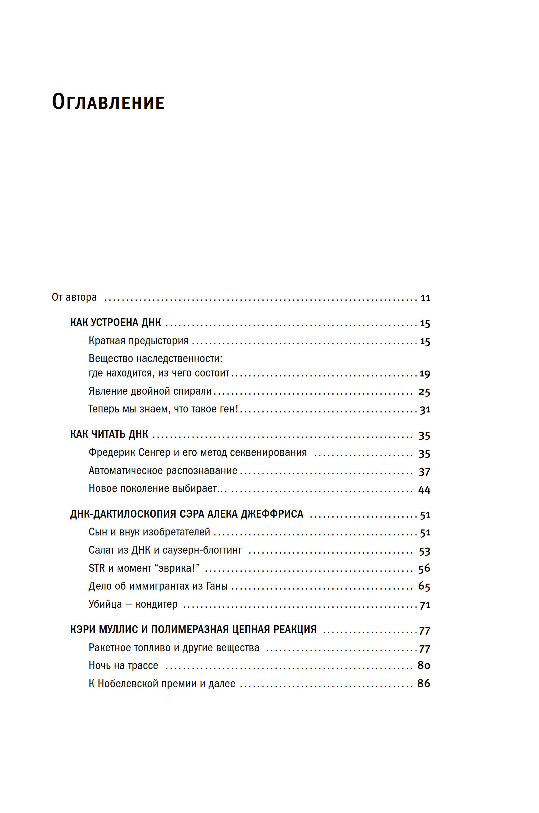 Автор книги рассказывает о методах исследования ДНК и о людях, которые стояли у истоков этих методов. Среди них — сэр Алек Джеффрис, который придумал ДНК-дактилоскопию, и Кэри Муллис, который смог размножить до заметных количеств одиночную молекулу ДНК.