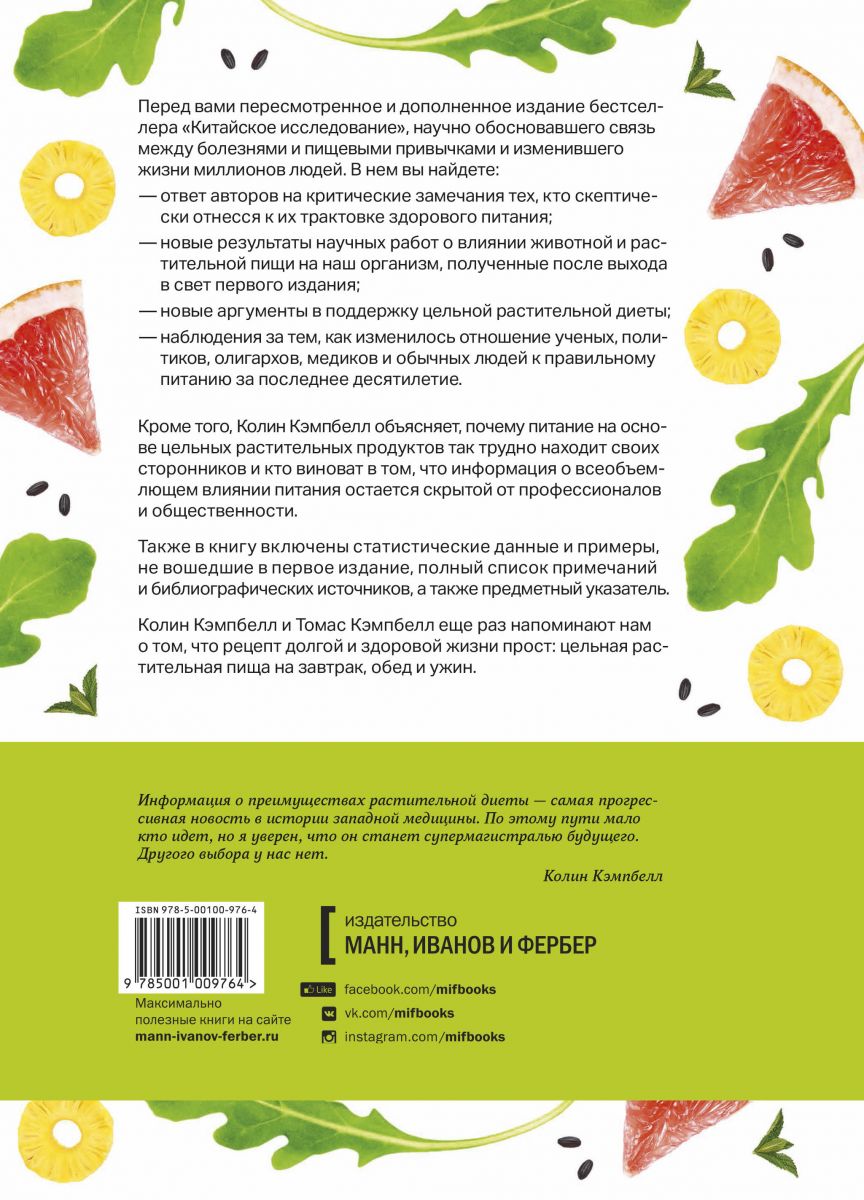 Колин Кэмпбелл объясняет, почему питание на основе цельных растительных продуктов так трудно находит своих сторонников и кто виноват в том, что информация о всеобъемлющем влиянии питания остается скрытой от профессионалов и общественности. Также в книгу включены статистические данные и примеры, не вошедшие в первое издание, полный список примечаний и библиографических источников, а также тематический указатель. Это книга-напоминание о том, что рецепт долгой и здоровой жизни прост: цельная растительная пища на завтрак, обед и ужин.