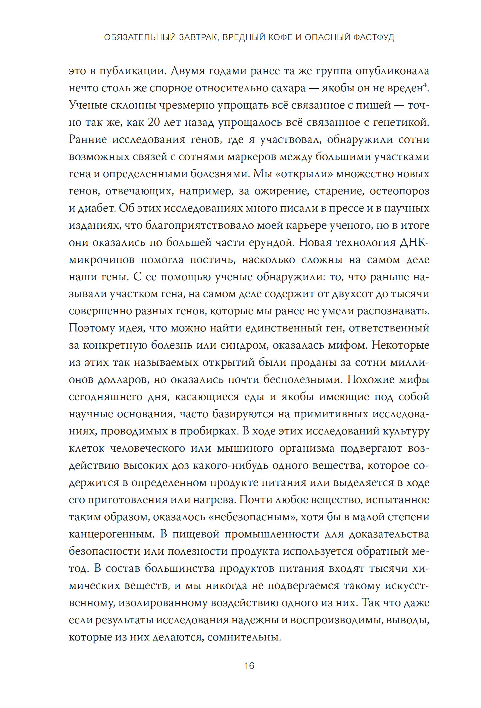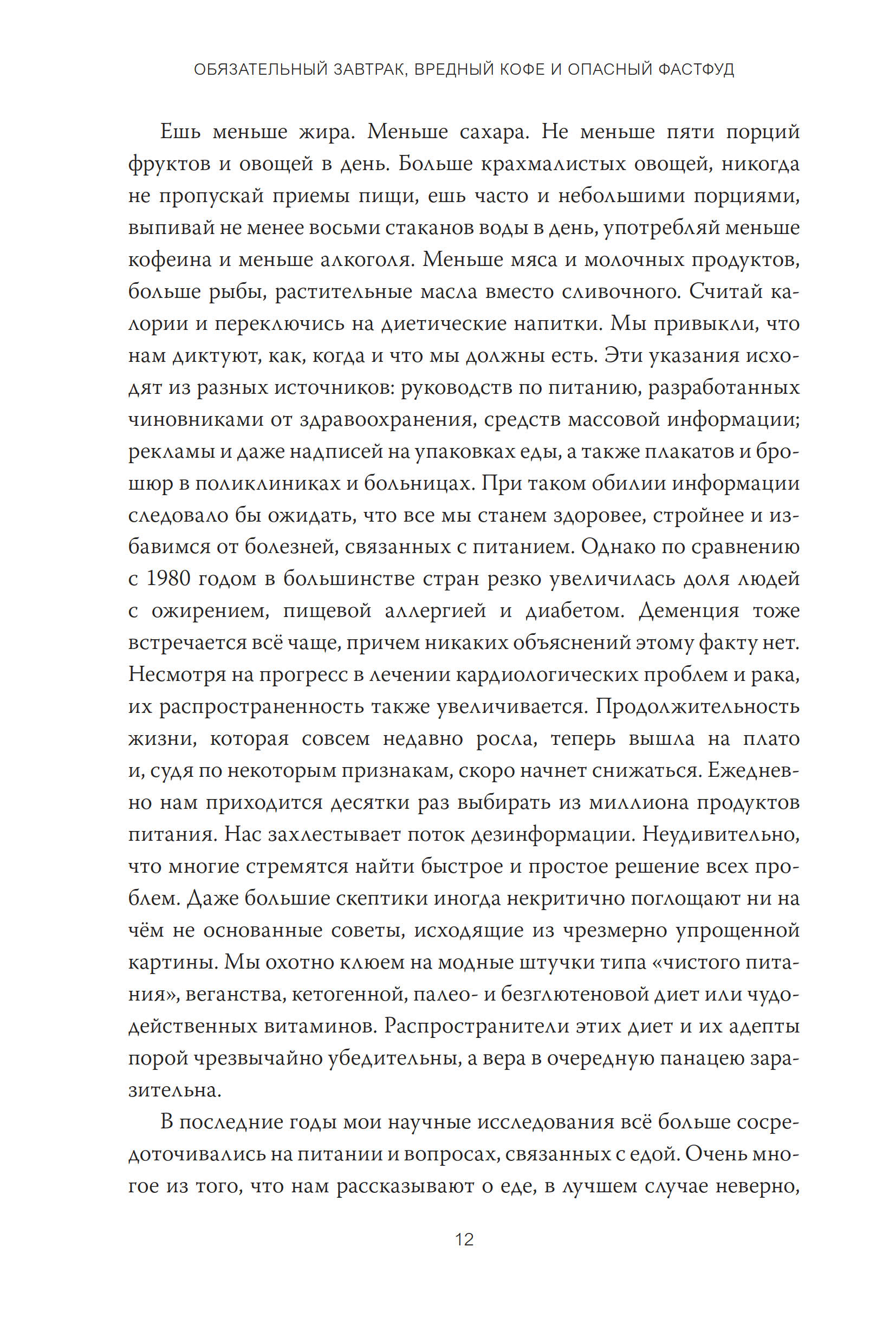 Тим Спектор провел беспрецедентное исследование, в результате которого понял, насколько необоснованно большинство глубоко укорененных в нашем сознании представлений о еде. В каждой главе он объясняет, почему почти всё, что нам рассказывали о еде, — неправда. Его книга заставляет усомниться во всех диетах на свете, всех официальных и научных рекомендациях, получаемых нами от медиков и чиновников от здравоохранения, во всех чудодейственных панацеях и надписях на этикетках продуктов.