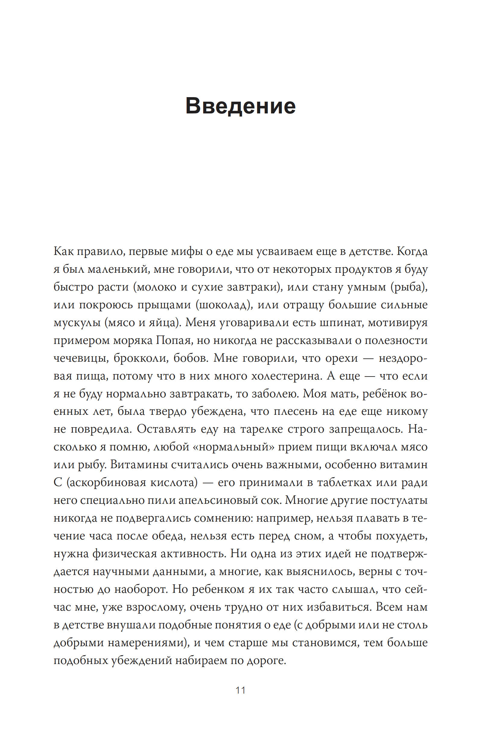 Как правило, первые мифы о еде мы усваиваем еще в детстве. Когда я был маленьким, мне говорили, что от некоторых продуктов я буду быстро расти (молоко и сухие завтраки), стану умным (рыба), покроюсь прыщами (шоколад) или отращу большие сильные мускулы (мясо и яйца). Меня уговаривали есть шпинат, мотивируя примером моряка Попая, но никогда не рассказывали о полезности чечевицы, брокколи, бобов. Мне говорили, что орехи — нездоровая пища, потому что в них много холестерина. А еще — что если я не буду нормально завтракать, то заболею. Моя мать, дитя военных лет, была твердо убеждена, что плесень на еде еще никому не повредила. Оставлять еду на тарелке строго запрещалось. Насколько я помню, любой «нормальный» прием пищи включал мясо или рыбу. Витамины считались очень важными, особенно витамин C (аскорбиновая кислота) — его принимали в таблетках или пили апельсиновый сок. Вот еще постулаты, которые никогда не подвергались сомнению: нельзя плавать в течение часа после обеда и есть перед сном, а чтобы похудеть, нужна физическая активность. Ни одна из этих идей не подтверждена научными данными, а многие, как выяснилось, верны «с точностью до наоборот». Но ребенком я их так часто слышал, что сейчас мне, уже взрослому, очень трудно от них избавиться. Всем нам в детстве внушали подобные понятия о еде — с добрыми или не очень намерениями — и чем старше мы становимся, тем больше подобных убеждений набираем по дороге.