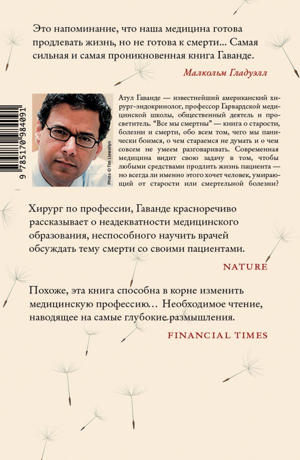 Это книга о старении, смертельной болезни, смерти — то есть о вещах, которых мы так боимся, что стараемся вообще не думать о них, вытеснить на периферию сознания. Автор книги, знаменитый американский хирург Атул Гаванде, уверен, что прятать голову в песок неправильно: смерть — часть жизни, ее естественное завершение, и именно в таком качестве, осознанно и спокойно, и следует ее принимать. Беда в том, что старость и умирание в современной культуре проходят по ведомству медицины, которая считает смерть просто процедурной неудачей, фатальным техническим сбоем. Не пытаясь понять, что на самом деле важно и ценно для человека в последние месяцы, недели и дни его жизни, мы героически «боремся до последнего», испытывая на терминальном больном все новые способы лечения — столь же мучительные, сколь и бесполезные. Как изменить эту ситуацию? Как найти нужные слова для близких, чья жизнь подходит к концу? Как научиться правильно относиться к смерти?