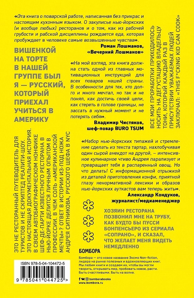 Проникновенная и правдивая история шефа-де-парти одного из самых известных ресторанов Нью-Йорка. Рассказ без цензуры, эссе как пуля, книжка на час, суть без прикрас, с юмором и наповал. Такое сложно придумать, такое можно только пережить!