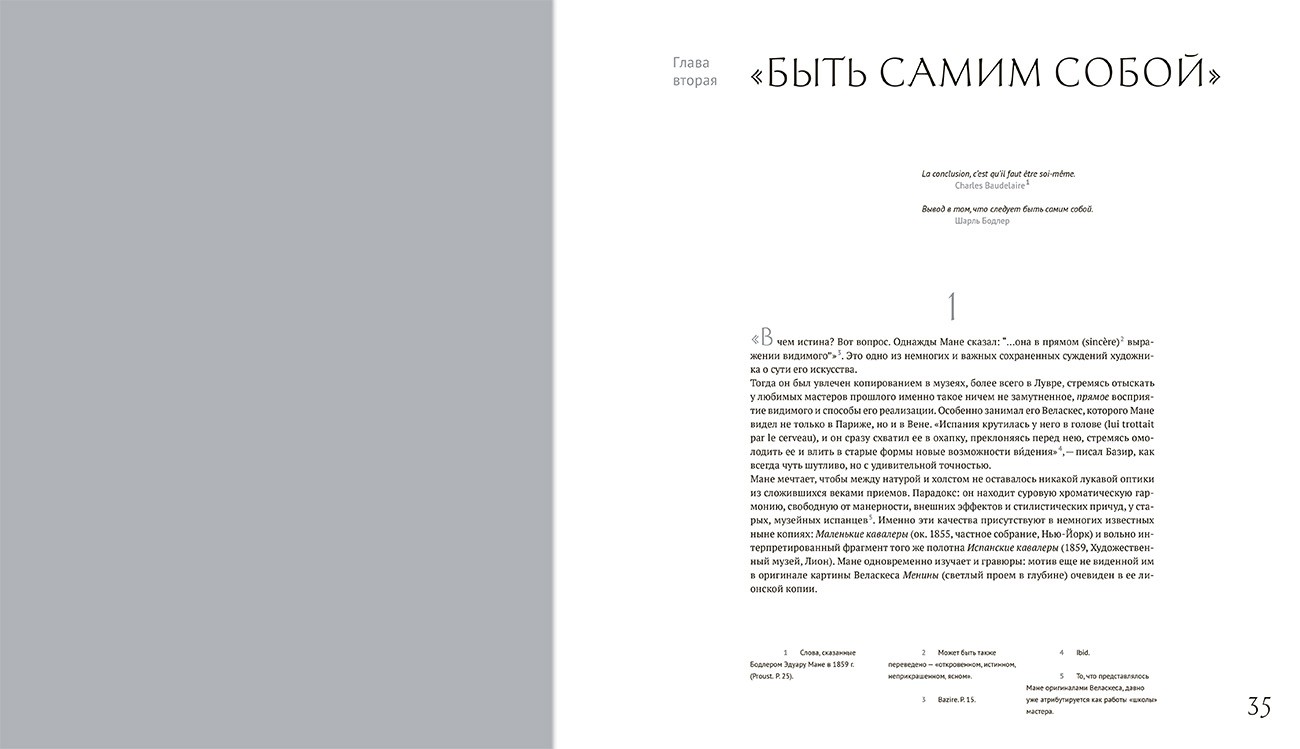 Эдуар Мане — художник XIX века, но именно с него начинается отсчёт времени Нового искусства. Он — последний из художников, в котором ощущается высокая традиционность, интонация и манера старых мастеров. И, одновременно, это художник, совершивший прорыв к искусству современному, бунтарь и ниспровергатель основ, первый художник, свободный от прежних визуальных штампов и чужих концепций. Вот что пишет о Мане автор книги: «Для каждой эпохи он иной, за обманчивой его ясностью — вечная недосказанность, творя будущее, он остаётся и в прошлом, соединяя времена. В нём минувшее и грядущее, начала и концы».