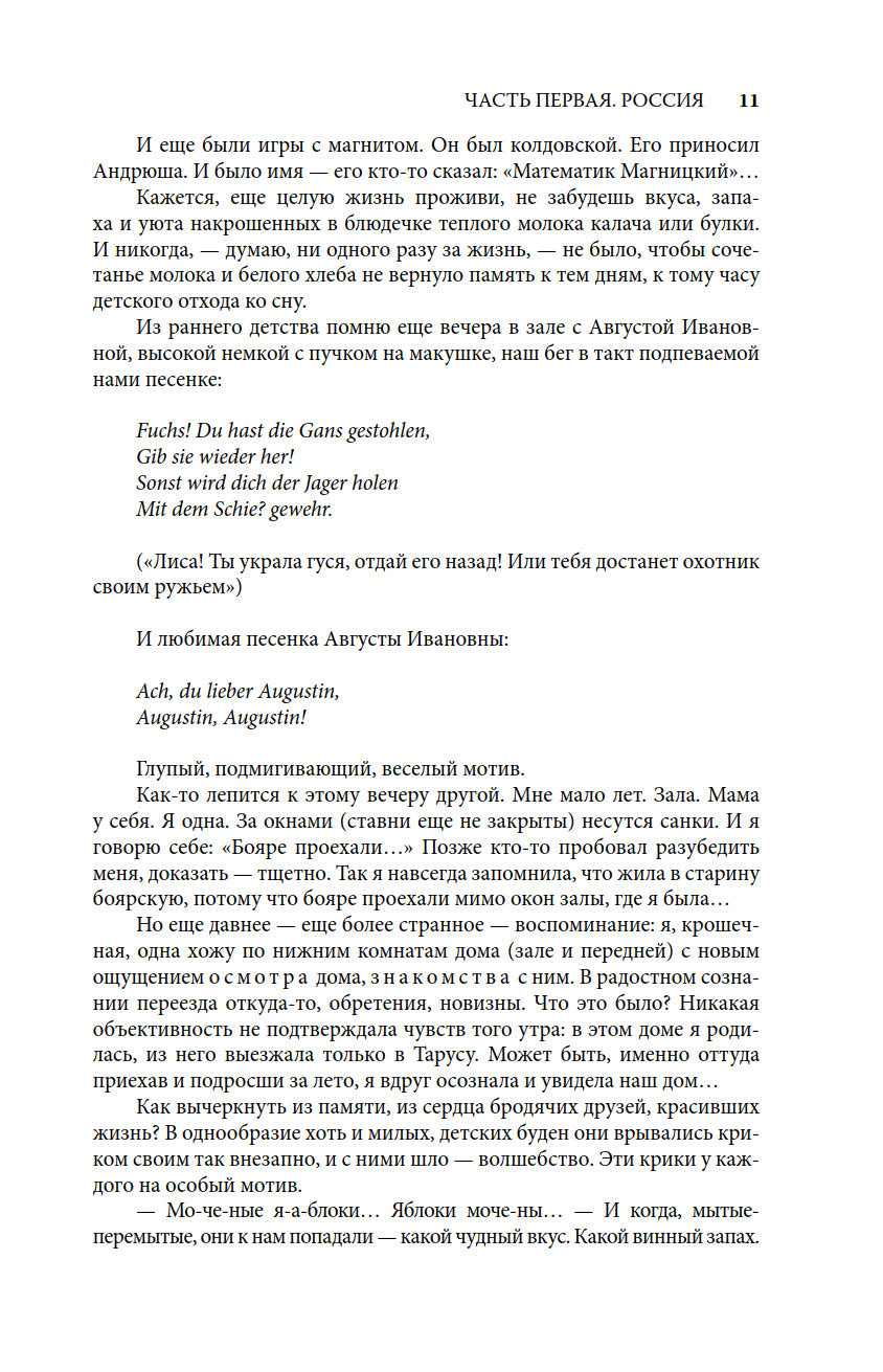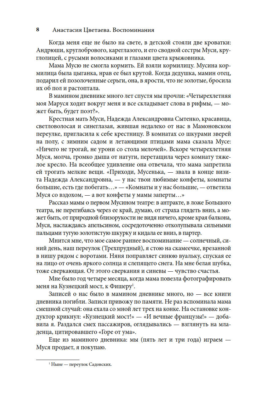 «Воспоминания» Анастасии Цветаевой содержат поистине бесценный материал о семье создателя ГМИИ им. А.С. Пушкина профессора И.В. Цветаева. Детство Анастасии и ее сестры Марины, показанное в книге с искренней теплотой, являлось и самым счастливым временем их жизни. Насыщенное трогательными мелочами быта, повествование разворачивается на живописном фоне мест, где жили Цветаевы — в России, в европейских пансионах. И, конечно, главными людьми для сестер в ту пору были родители — мать, талантливая пианистка, и отец, беззаветно преданный своему музею.