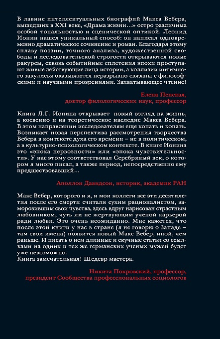Макса Вебера социологи давно и безоговорочно причисляют к классикам своей науки. Издано большое число его биографий. В настоящей книге главное внимание уделяется не анализу его теоретического наследия, а его личности. На протяжении последнего столетия Макс Вебер рассматривался как проповедник рационализма в теории и этического идеала героической аскезы, а его собственная жизнь считалась чуть ли не воплощением этого идеала. Новые исследования показали, что Макс Вебер был живым, страдающим, мятущимся человеком и его жизнь определялась не только разумом, но и страстями. Автор анализирует жизнь героя во всем богатстве ее проявлений — от политических взглядов и стремлений до глубинных психологических механизмов, диктующих часто неожиданные и не поддающиеся рациональному объяснению решения и поступки.