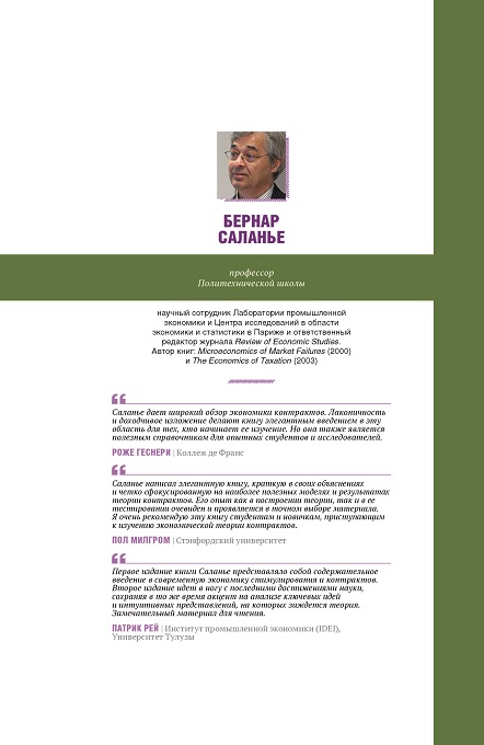 Теория контрактов возникла вследствие неспособности модели общего равновесия учесть стратегические взаимодействия агентов, порождаемые асимметричностью информации. Экономика контрактов, переработанная и обновленная во втором издании, служит кратким и ясным введением в теорию контрактов для аспирантов экономических специальностей и профессиональных экономистов. В книге представлены основные модели, используемые в теории контрактов, в частности базовые модели неблагоприятного отбора, сигнализирования и риска недобросовестного поведения. Главное внимание уделяется описанию методов анализа моделей. Кроме того, дается краткое введение в прикладные области теории контрактов в различных отраслях экономики. Цель автора — предоставить читателям инструменты, важные для понимания основных моделей теории контрактов и создания собственных моделей.