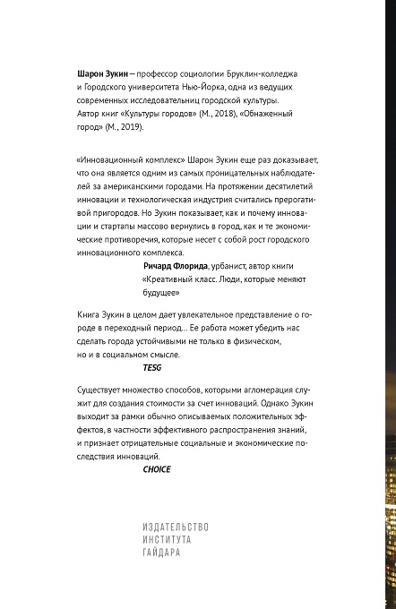 Новая книга известного урбаниста, профессора социологи Шарон Зукин «Инновационный комплекс» показывает, как новая городская экономика формируется предприятиями и организациями, работающими в сфере цифровых технологий, городскими властями и техно-финансовой меритократией. Внимательно изучая «инновации» в Нью-Йорке с момента падения экономики города в результате краха доткомов в 2000 г. до его становления как второй по величине экосистемы стартапов в 2010-х гг., книга исследует появление новых организационных, географических и дискурсивных пространств, которые буквально укореняют цифровое производство на местах, формируя технически компетентную рабочую силу, государственно-частные некоммерческие партнерства и агрессивную предпринимательскую культуру.