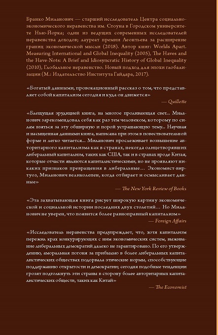 Сегодня мы все — капиталисты. Впервые в истории человечества на земном шаре господствует одна экономическая система. В книге «Капитализм и ничего больше» видный экономист Бранко Миланович объясняет причины этого решающего исторического сдвига со времен феодализма, а потом коммунизма. Перебирая различные разновидности капитализма, он задается вопросом: каковы наши перспективы на более справедливое миро устройство сегодня, когда альтернатив капитализму не осталось? Его выводы отрезвляют, но не ведут к фатализму. У капитализма много недостатков, но немало и достоинств — и он с нами надолго. Наша задача — усовершенствовать его.