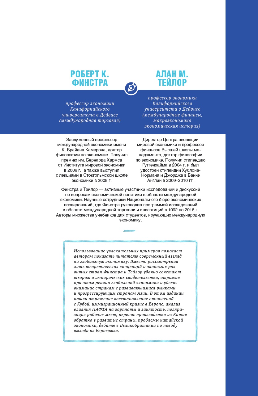 Учебник Роберта Финстры и Алана Тейлора «Международная макроэкономика» написан одними из самых известных исследователей в данной области, имеющих большой опыт преподавательской работы. Использование увлекательных примеров помогает авторам показать читателю современный взгляд на глобальную экономику. Тогда как большинство существующих учебников по международной экономике посвящены рассмотрению теоретических концепций и экономик развитых стран, Финстра и Тейлор удачно сочетают теорию и эмпирические свидетельства, отражая при этом реалии глобальной экономики и уделяя внимание странам с развивающимися рынками и прогрессирующим странам (Индии, Китаю, государствам Юго-Восточной Азии). Четвертое издание было в значительной степени переработано и включает новые данные и приложения, а также дополнено заголовками, отражающими стремительные изменения в международной экономике на протяжении последних трех лет. В этом издании нашли отражение восстановление отношений с Кубой, иммиграционный кризис в Европе, анализ влияния НАФТА на зарплаты и занятость, поляризация рабочих мест, перенос производства из Китая обратно в развитые страны, проблемы китайской экономики, дебаты в Великобритании по поводу выхода из Евросоюза. Книга предназначена студентам, изучающим макроэкономику, преподавателям макроэкономики, а также ученым-макроэкономистам.