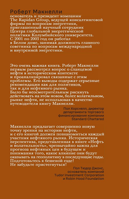 Погружаясь в историю, полную конфликтов, интриг и крайней неопределенности, Роберт Макнелли описывает как с первых лет истории нефтяной промышленности неудержимая и пагубная волатильность цен заставляла руководителей нефтяных компаний и чиновников, курирующих нефтяную отрасль, предпринимать невероятные усилия для того, чтобы стабилизировать нефтяные цены, осуществляя контроль над объемами добычи. Колоссальные рыночные интервенции — производимые сначала компанией Standard Oil, принадлежащей Рокфеллеру, затем государственными регуляторами в кооперации с крупнейшими нефтяными компаниями и, наконец, ОПЕК — с той или иной степенью успешности помогали укротить «чудовище». Макнелли, известный эксперт по вопросам нефти и нефтяной политики, объясняет, к каким последствиям может привести ослабление влияния ОПЕК. При этом автор развеивает мифы, предлагает свои рекомендации и указывает на ошибки, которые следует избегать в ситуации, когда мы стоим перед лицом столь нежеланного возвращения взлетов и падений нефтяных цен.