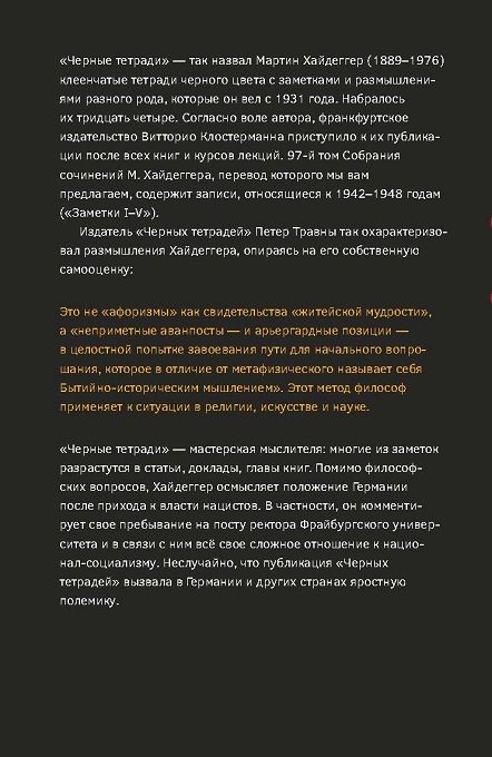 «Черные тетради» — так назвал Мартин Хайдеггер (1889–1976) клеенчатые тетради черного цвета с заметками и размышлениями разного рода, которые он вел с 1931 года. Набралось их тридцать четыре. Согласно воле автора, франкфуртское издательство Витторио Клостерманна приступило к их публикации после всех книг и курсов лекций. 97-й том Собрания сочинений М. Хайдеггера, перевод которого мы вам предлагаем, содержит записи, относящиеся к 1942–1948 годам («Заметки I–V»).