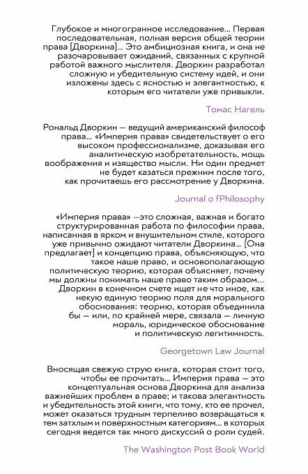 С присущей ему проницательностью и ясностью стиля Рональд Дворкин написал мастерское объяснение работы англо-американская правовой системы и принципов, на которых она основана. Он утверждает, что наиболее фундаментальный смысл права состоит не в том, чтобы сообщать о консенсусе или обеспечивать эффективные средства для достижения социальных целей, а в том, чтобы отвечать требованию о том, чтобы политическое сообщество действовало последовательным и принципиальным образом по отношению ко всем его членам. В свете этой точки зрения он анализирует дела, подлежащие рассмотрению по нормам общего права, дела, возникающие в рамках статутного права, и имевшие большое значение дела, связанные с положениями Конституции, решения по которым принимал Верховный суд США. Дворкин систематически демонстрирует, что его концепция политической и правовой целостности является ключом к англо-американской правовой теории и практике. «Империя права» — это полномасштабное изложение его теории права, которое будет изучаться и обсуждаться — учеными и теоретиками, юристами и судьями, студентами и политическими активистами — в течение многих последующих лет.