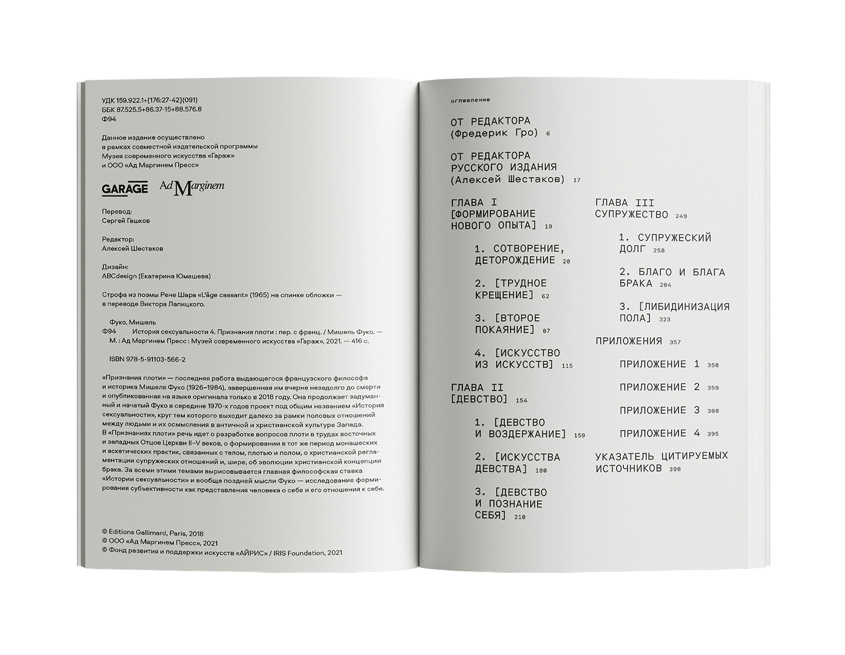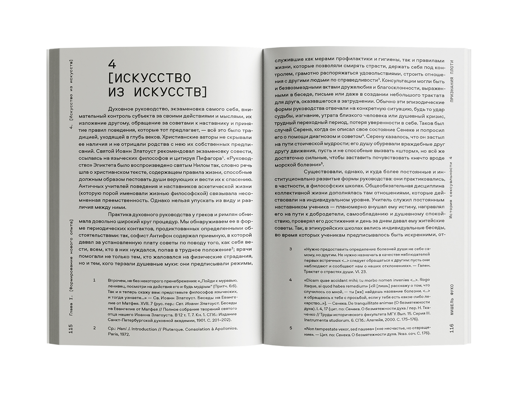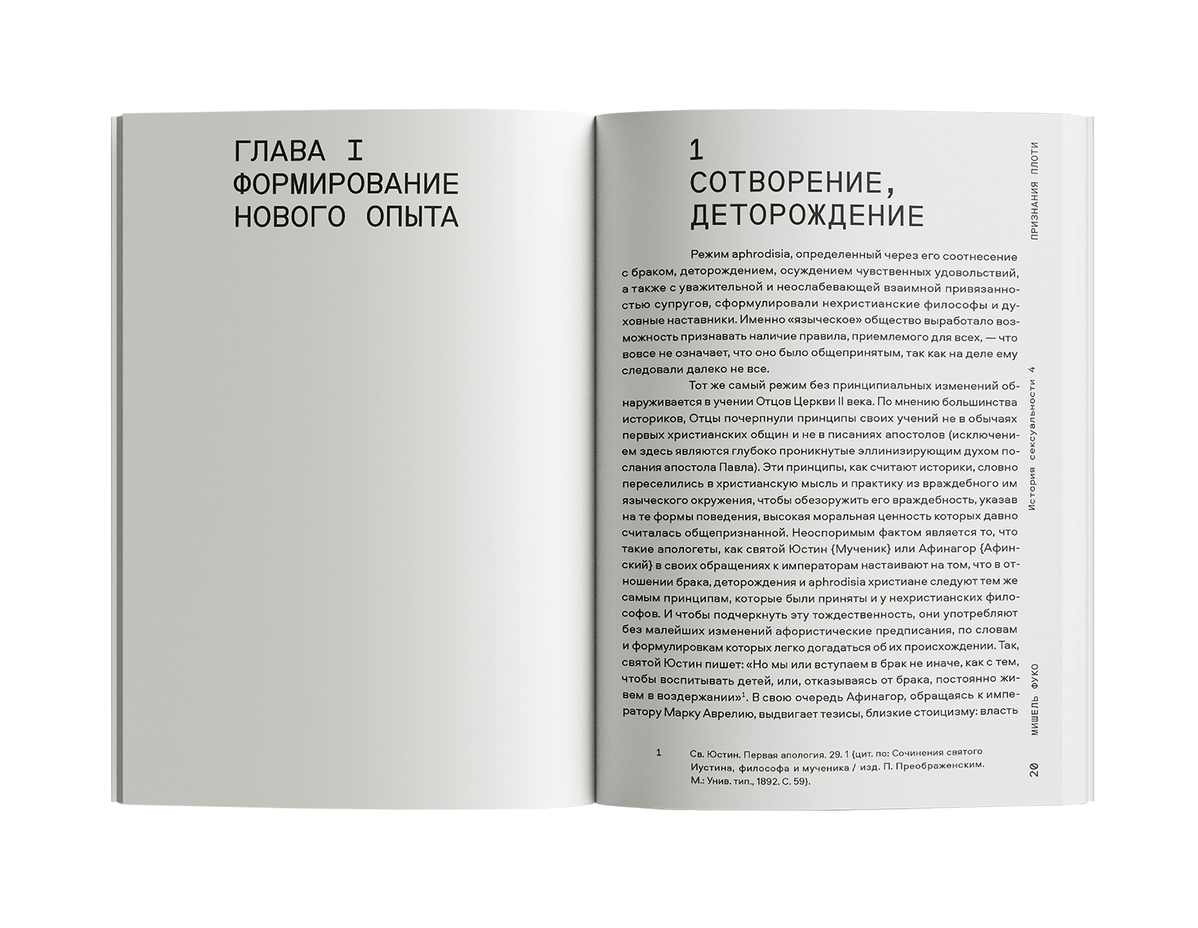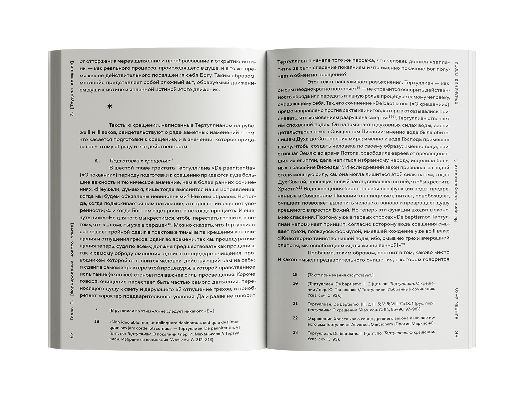 «Признания плоти» — последняя работа выдающегося французского философа и историка Мишеля Фуко (1926–1984), завершенная им вчерне незадолго до смерти и опубликованная на языке оригинала только в 2018 году. Она продолжает задуманный и начатый Фуко в середине 1970-х годов проект под общим названием «История сексуальности», круг тем которого выходит далеко за рамки половых отношений между людьми и их осмысления в античной и христианской культуре Запада. В «Признаниях плоти» речь идет о разработке вопросов плоти в трудах восточных и западных Отцов Церкви II–IV веков, о формировании в тот же период монашеских и аскетических практик, связанных с телом, плотью и полом, о христианской регламентации супружеских отношений и, шире, об эволюции христианской концепции брака. За всеми этими темами вырисовывается главная философская ставка «Истории сексуальности» и вообще поздней мысли Фуко — исследование формирования субъективности как представления человека о себе и его отношения к себе.