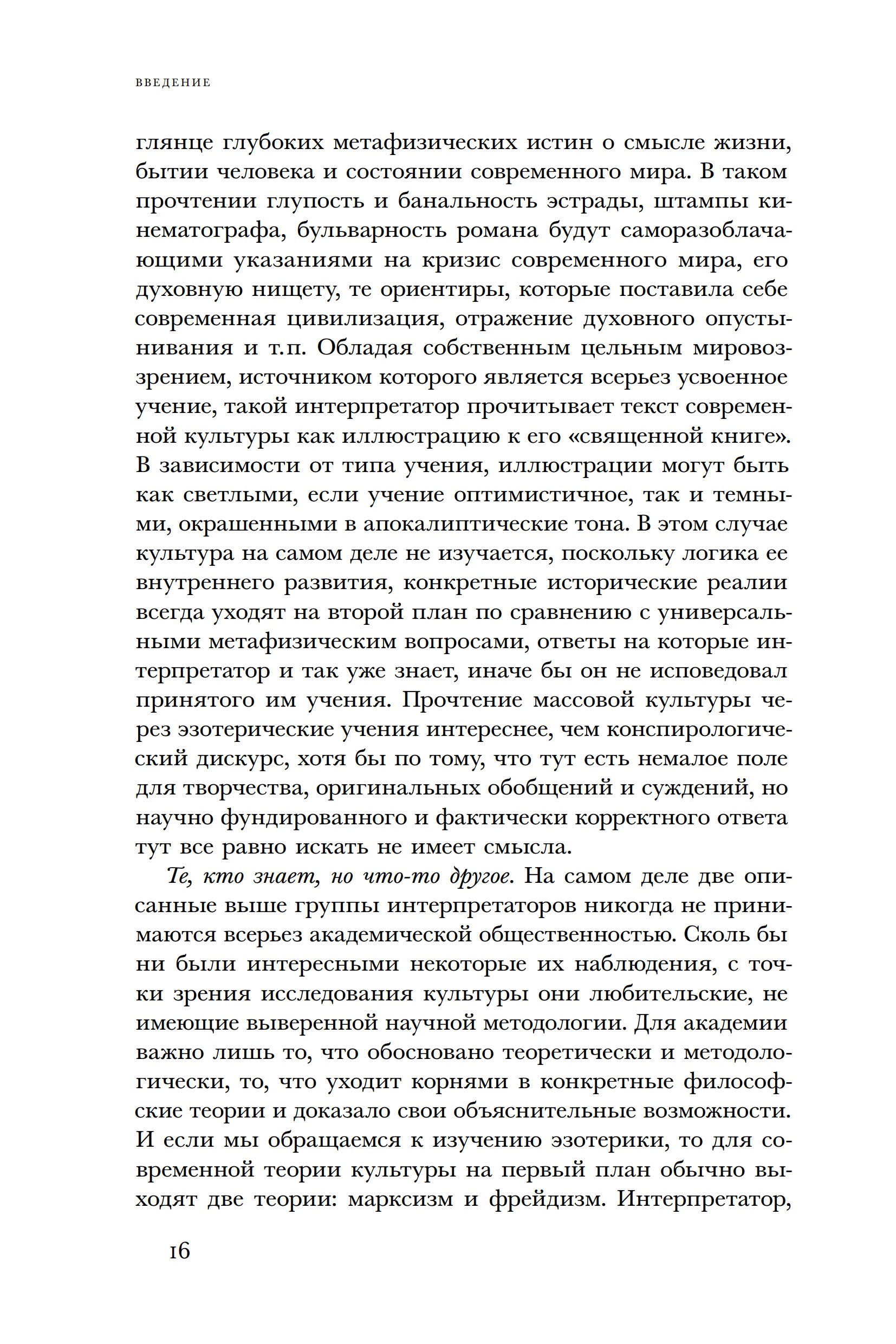 Уже в самой этимологии слова «эзотерический» содержится указание на таинственный характер знания, доступного только узкому кругу посвященных. Но что происходит, когда знание для избранных становится частью массовой культуры? Как сочетается таинственное и популярное? Решению этих и других вопросов посвящено исследование Павла Носачева. Автор прослеживает путь формирования эзотерических идей, образов и мифологем от середины XIX века (периода их становления) до современности, анализируя влияние эзотеризма на литературу, авангардный и массовый кинематограф, а также популярную музыку. Из книги читатель узнает, как эзотеризм объединяет Артура Мейчена и Говарда Лавкрафта, Антона Лавея и Резу Негарестани, Кеннета Энгера и Дэвида Линча, БГ и «Оргию праведников», Army of Lovers и Current 93, а также других писателей, музыкантов и режиссеров.