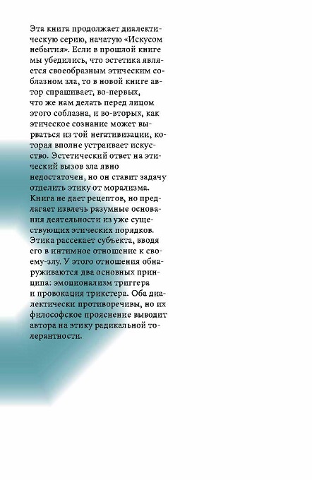 Книга продолжает серию, начатую «Искусством небытия». Автор задается вопросом, что делать перед лицом этического соблазна и как этическое сознание может вырваться из негативизации искусства.