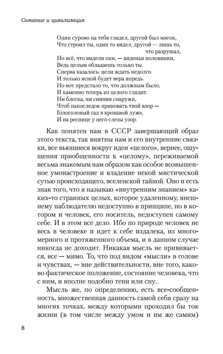 Книга «Сознание и цивилизация» представляет доклады Мамардашвили, его выступления и интервью, относящиеся к периоду с 1984 по 1990 годы.