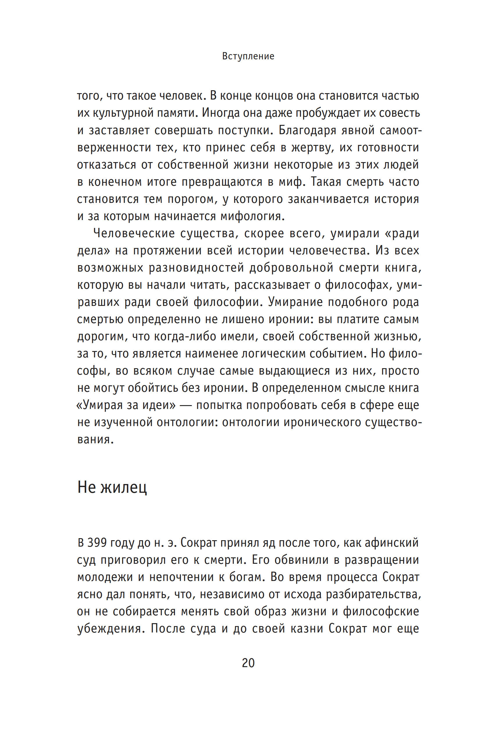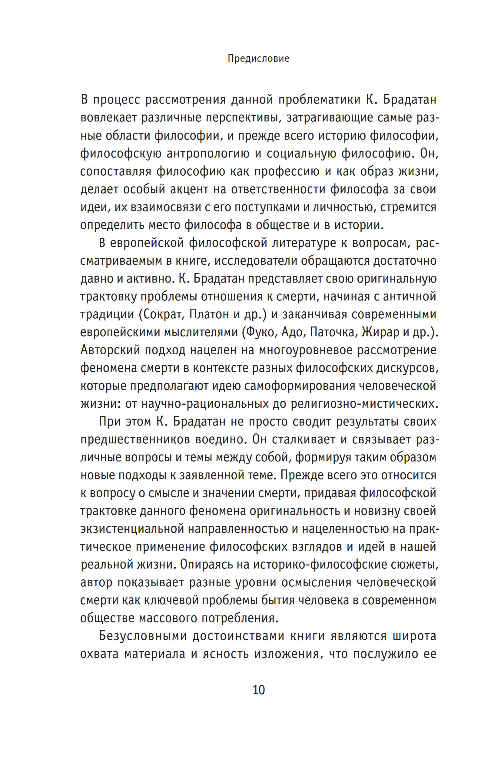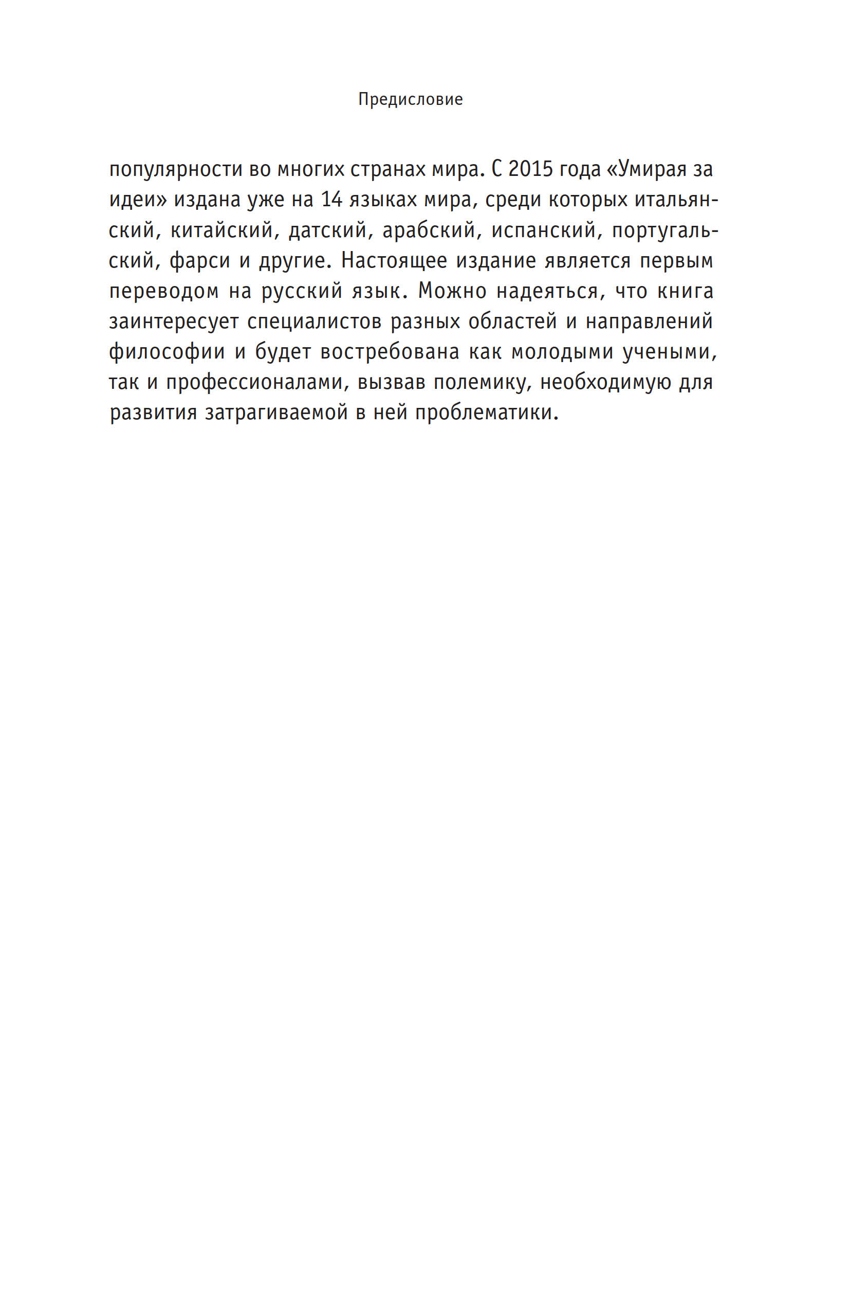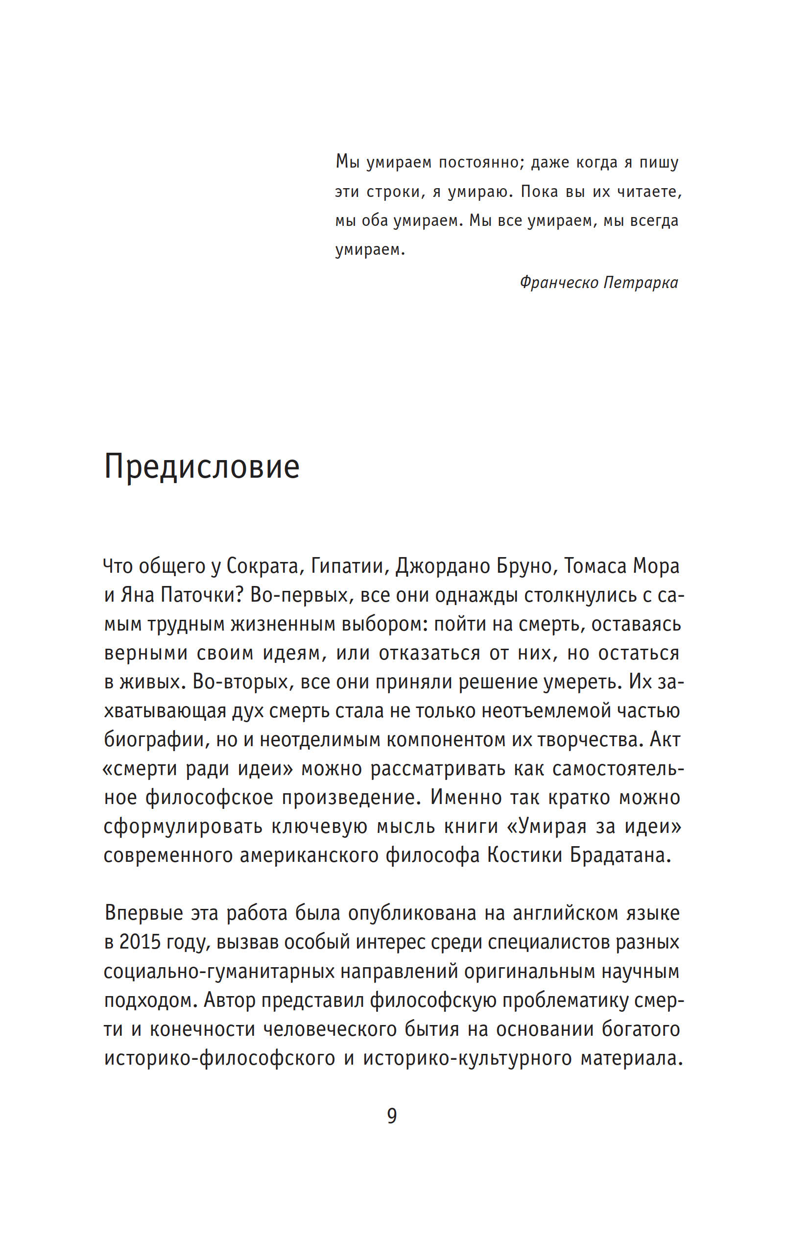Книга Костики Брадатана «Умирая за идеи» исследует ту предельную ситуацию, в которой оказываются философы, когда последним средством убеждения в своей правоте становятся их собственные умирающие тела и публичное зрелище их смерти. Работа основана прежде всего на материалах по истории философии, но она предлагает междисциплинарный подход к центральной проблеме. Это книга о Сократе и Хайдеггере, но также и о «посте до смерти» Ганди и самосожжении буддийского монаха, о Жираре и Пазолини, о самосовершенствовании и искусстве эссе. Философия, по мысли автора, не должна быть только академическим упражнением, но искусством жизни, а любое искусство жить сопровождается искусством умирать.
