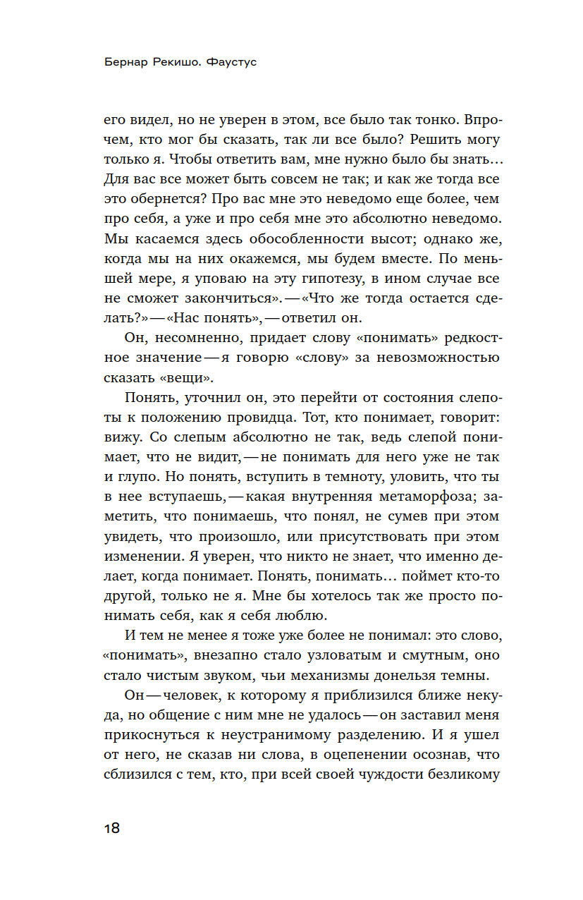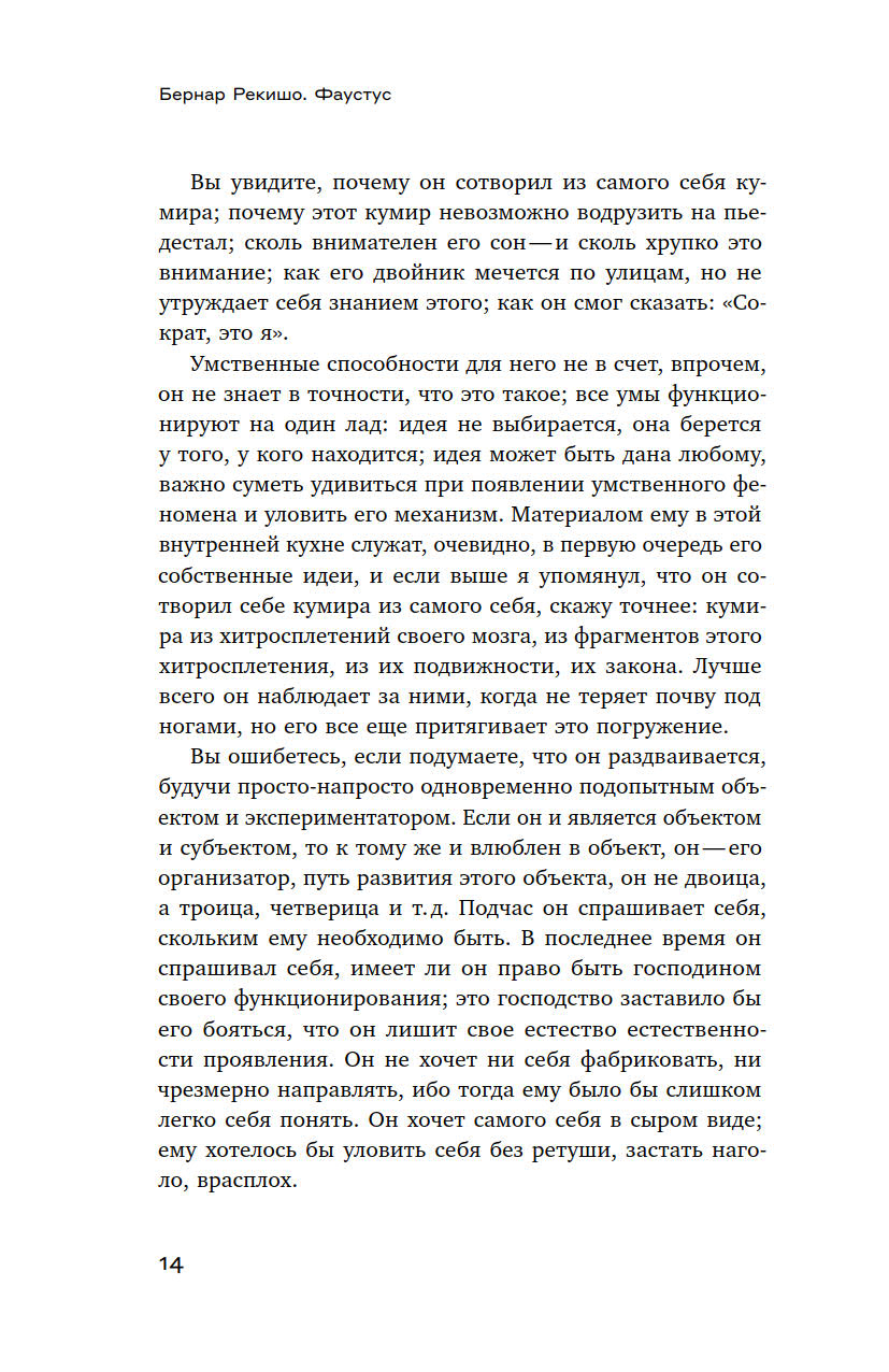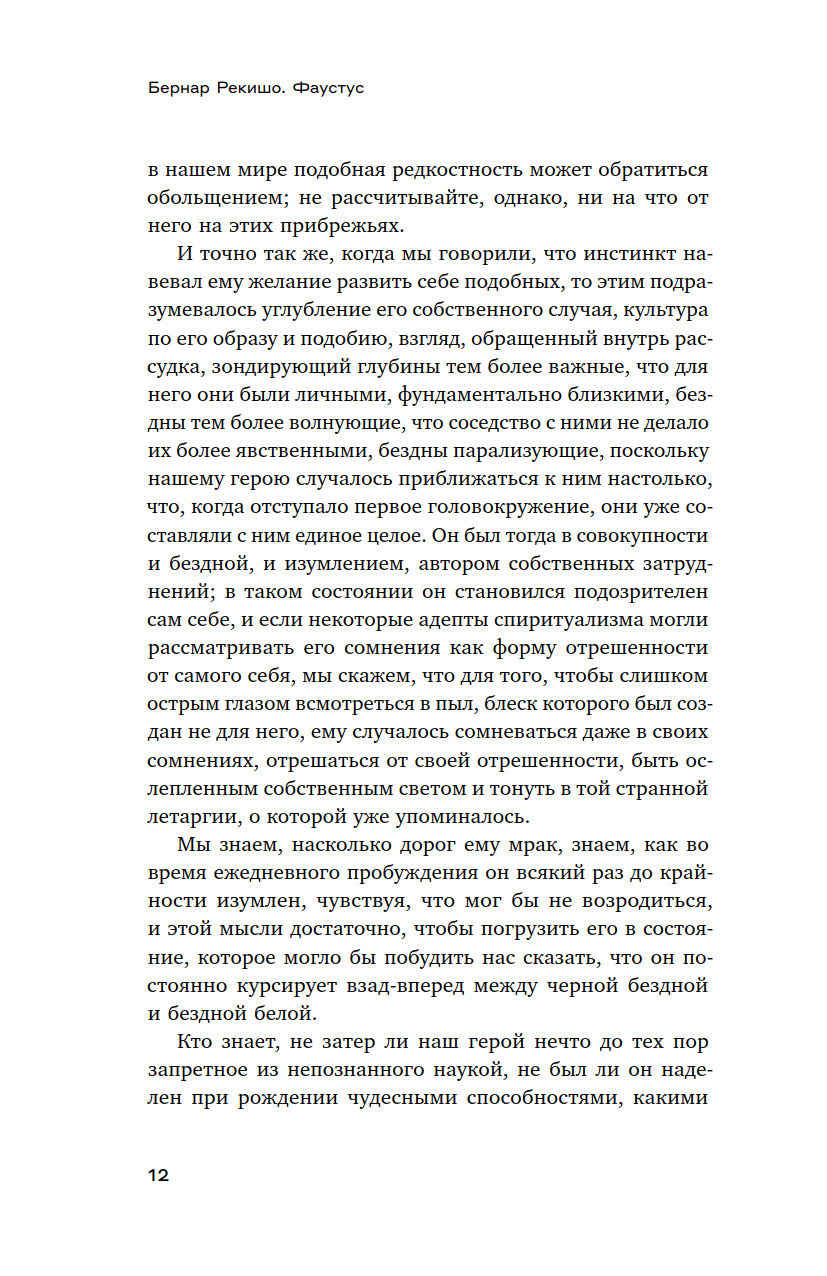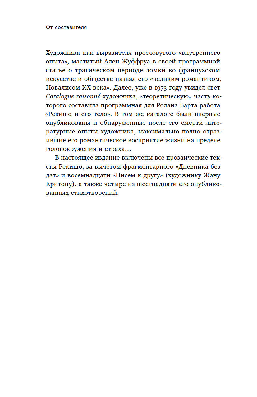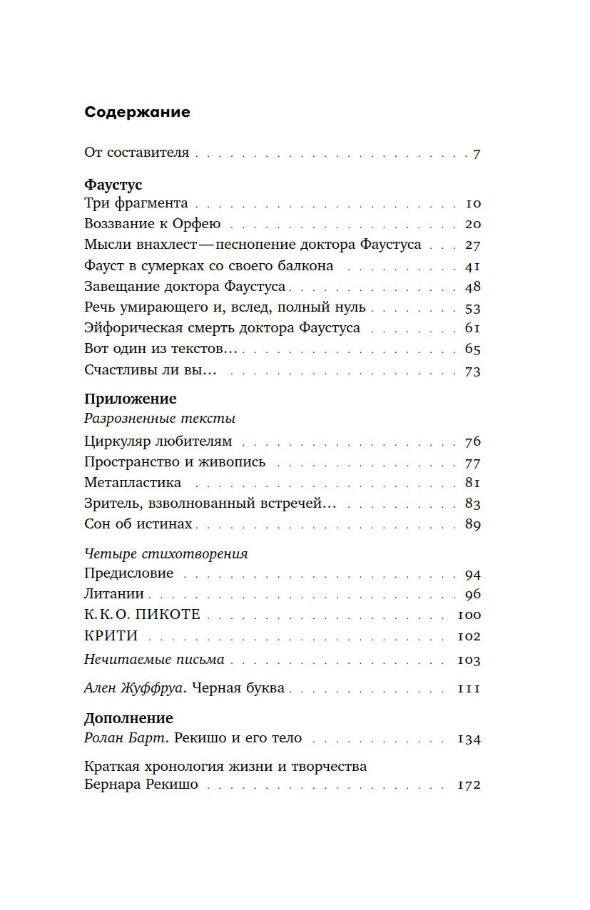 В настоящее издание вошли стихотворные и прозаические тексты Рекишо, в том числе незаконченный фрагментарный роман «Фаустус» — своего рода многофасеточный автопортрет художника, занимающий особое место в его наследии. В книгу также включены программные статьи Алена Жуффруа и Ролана Барта о Рекишо.
