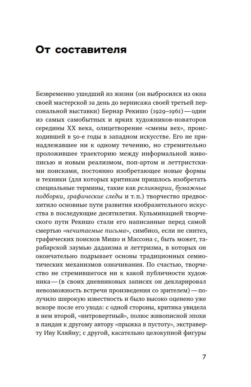 Один из самых ярких и самобытных художников XX века, визионер и отшельник Бернар Рекишо (1929–1961) за свою короткую жизнь успел создать и апробировать целый ряд новаторских живописных техник, для которых критикам приходилось изобретать специальные термины: реликварии, бумажные подборки, графические следы и т. д. В своих литературных опытах он не менее проницательно предвосхитил и едва зарождающиеся тенденции и направления — такие, как асемическое письмо, сонорная поэзия, принципы репетитивной музыки.