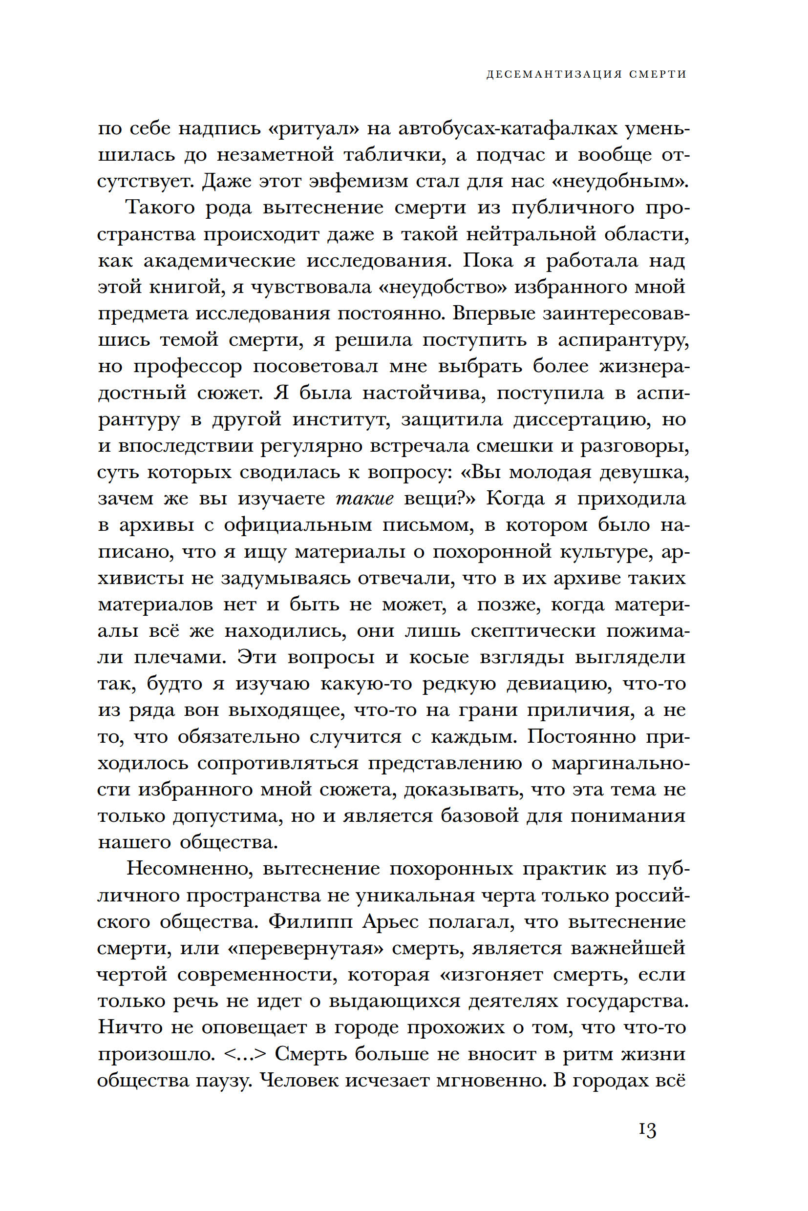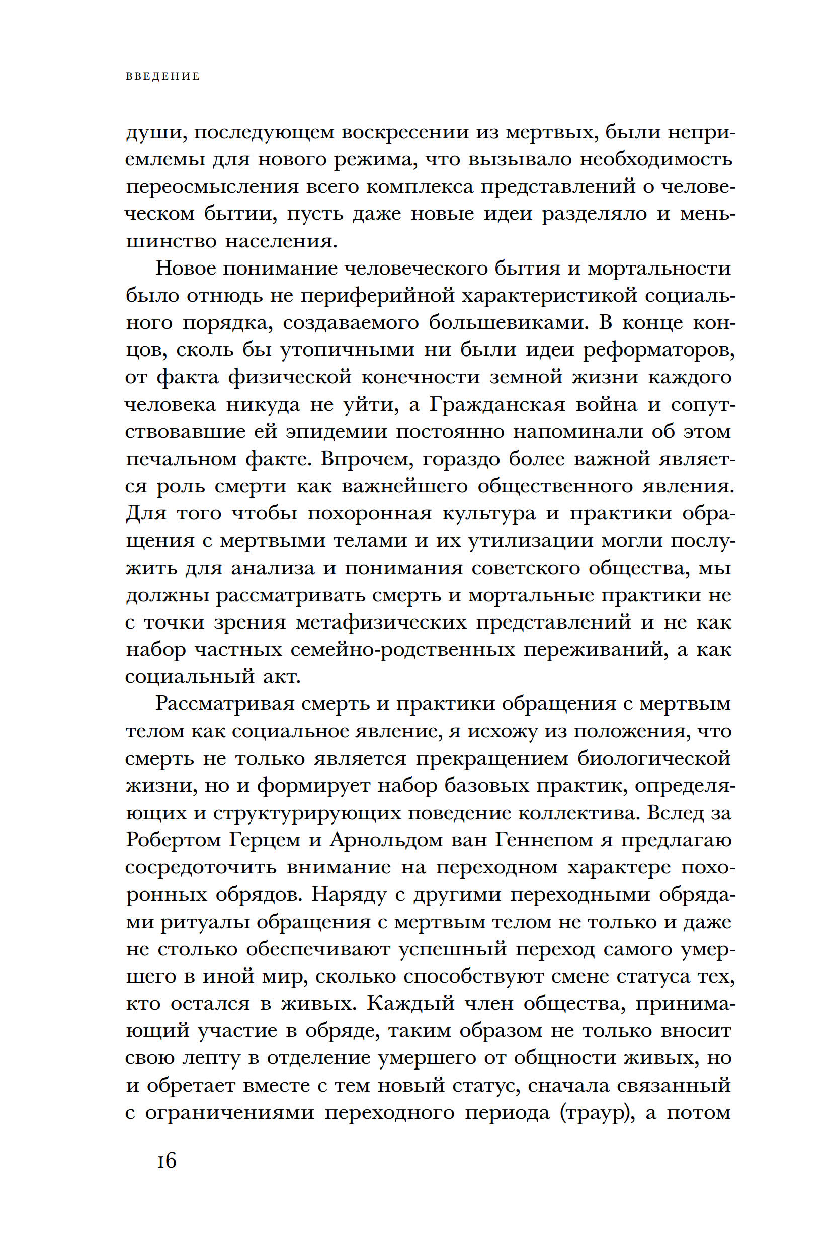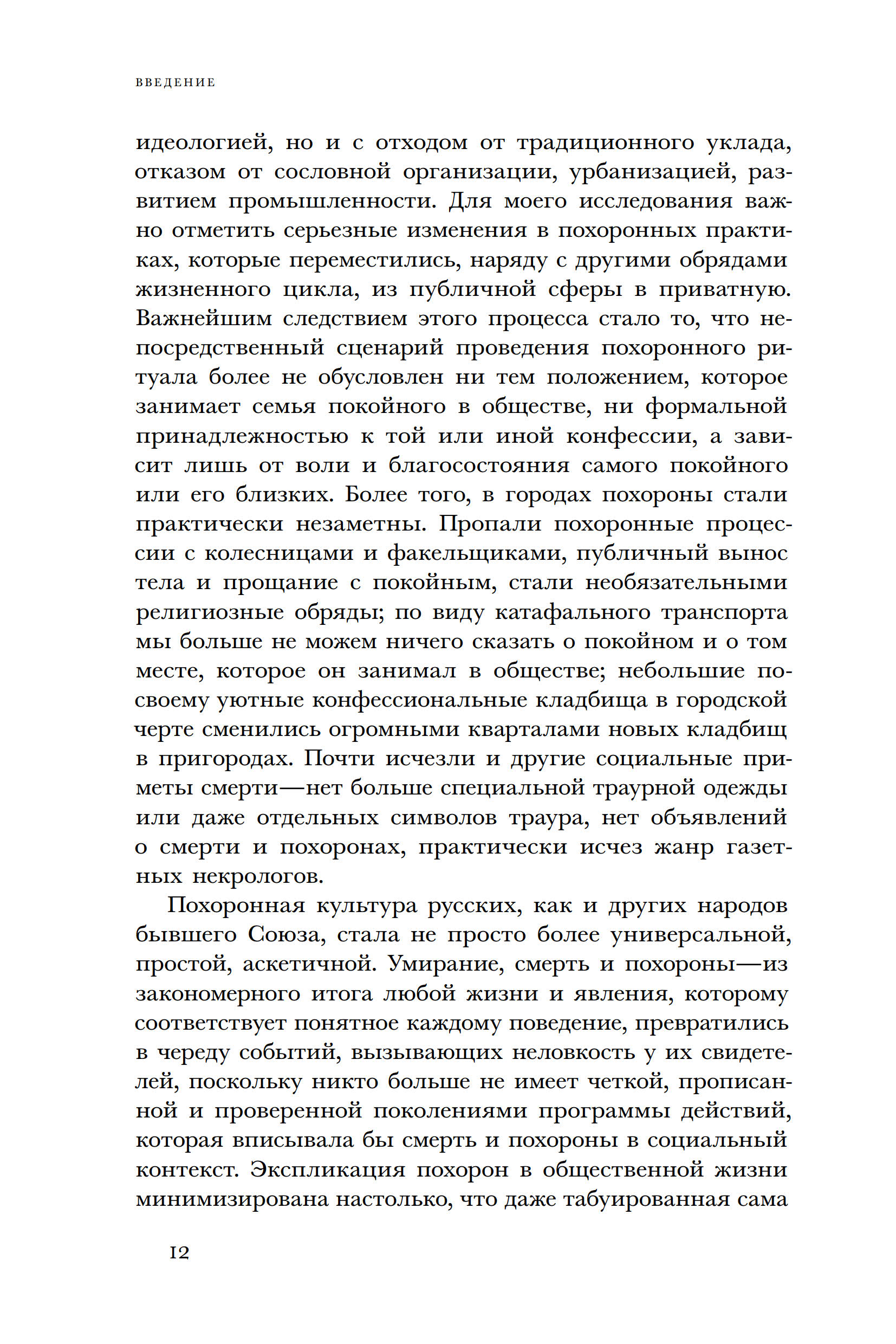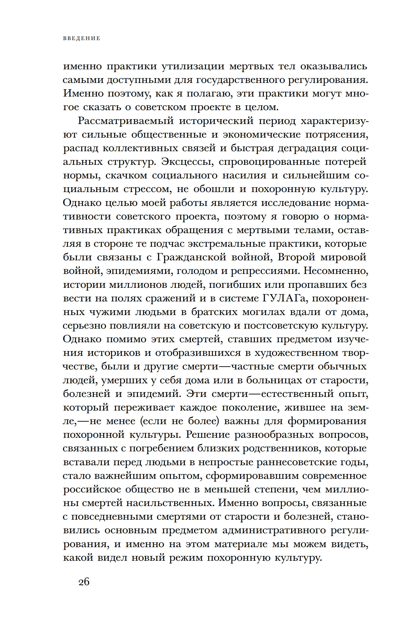 История СССР часто измеряется десятками и сотнями миллионов трагических и насильственных смертей — от голода, репрессий, войн, а также катастрофических издержек социальной и экономической политики советской власти. Но огромное число жертв советского эксперимента окружала еще более необъятная смерть: речь о миллионах и миллионах людей, умерших от старости, болезней и несчастных случаев. Книга историка и антрополога Анны Соколовой представляет собой анализ государственной политики в отношении смерти и погребения, а также причудливых метаморфоз похоронной культуры в крупных городах СССР. Эта тема долгое время оставалась в тени исследований о политических репрессиях и войнах, а также работ по традиционной деревенской похоронной культуре. Если эти аспекты советской мортальности исследованы неплохо, то вопрос о том, что представляли собой в материальном и символическом измерениях смерть и похороны рядового советского горожанина, изучен мало. Между тем он очень важен для понимания того, кем был (или должен был стать) «новый советский человек», провозглашенный революцией. Анализ трансформаций в сфере похоронной культуры проливает свет и на другой вопрос: был ли опыт радикального реформирования общества в СССР абсолютно уникальным или же, несмотря на весь свой радикализм, он был частью масштабного модернизационного перехода к индустриальным обществам?