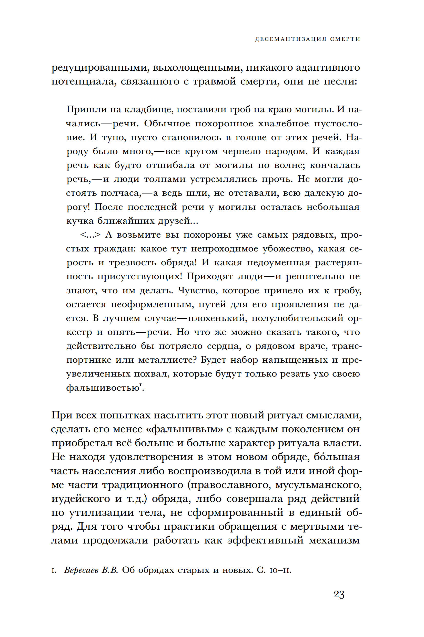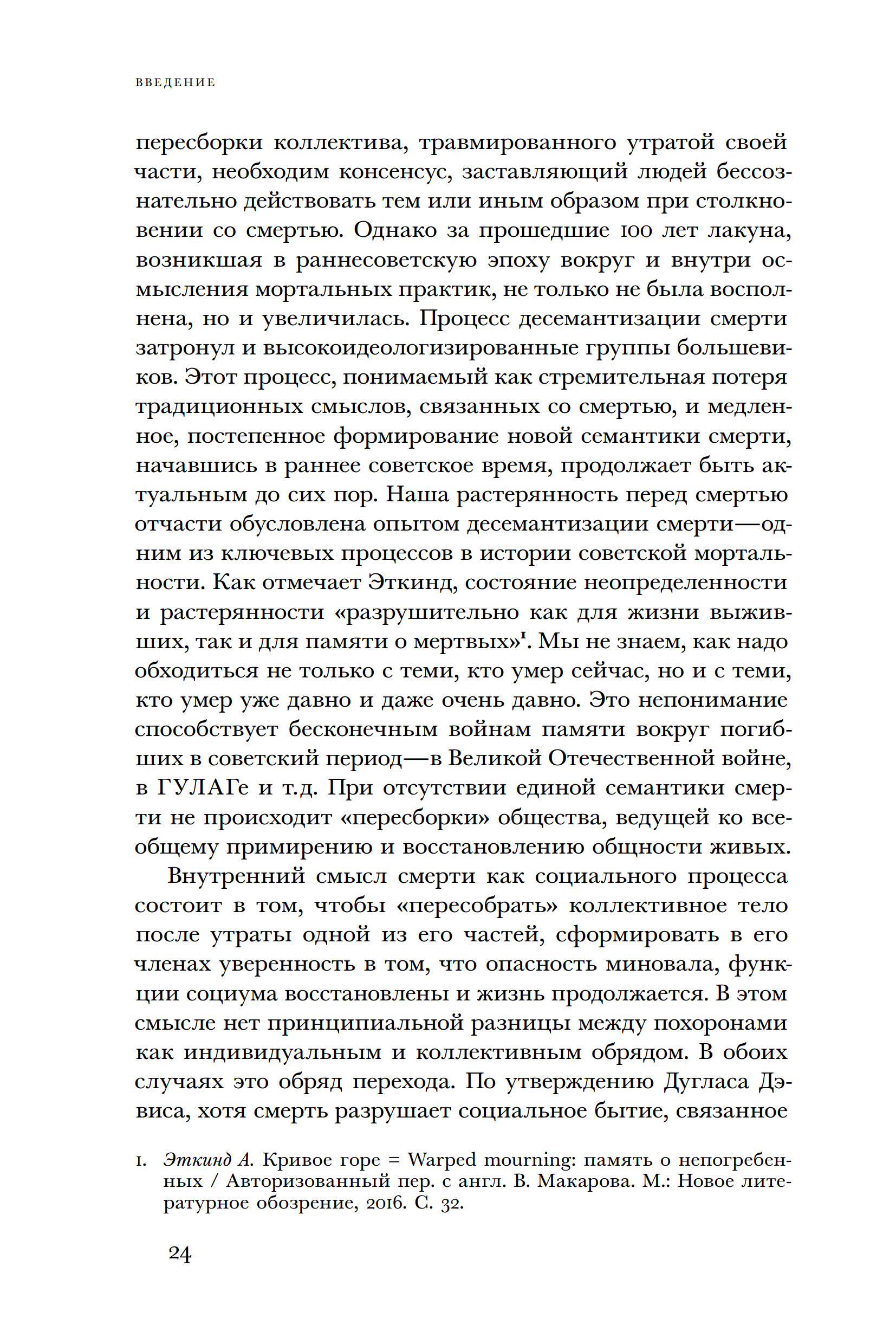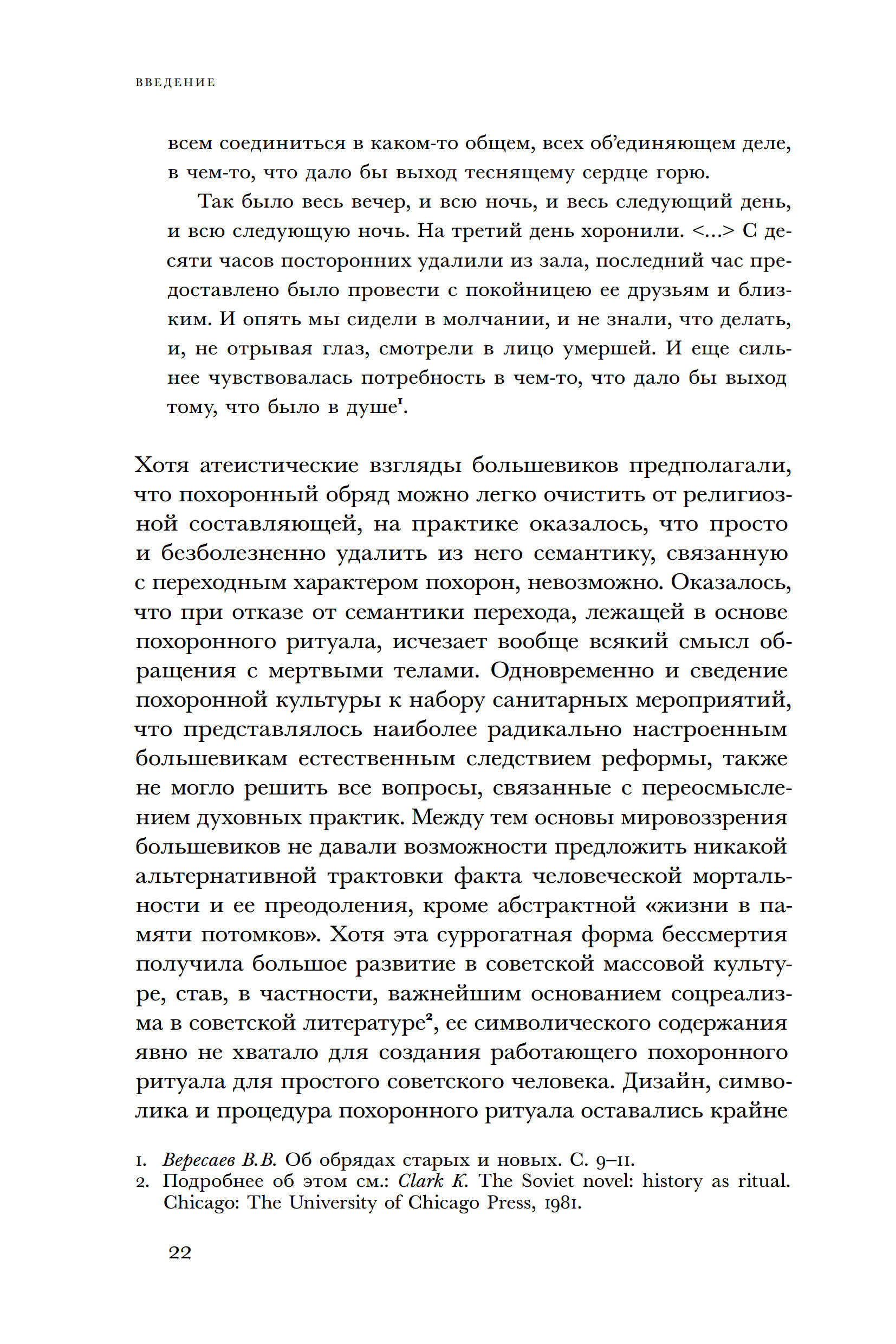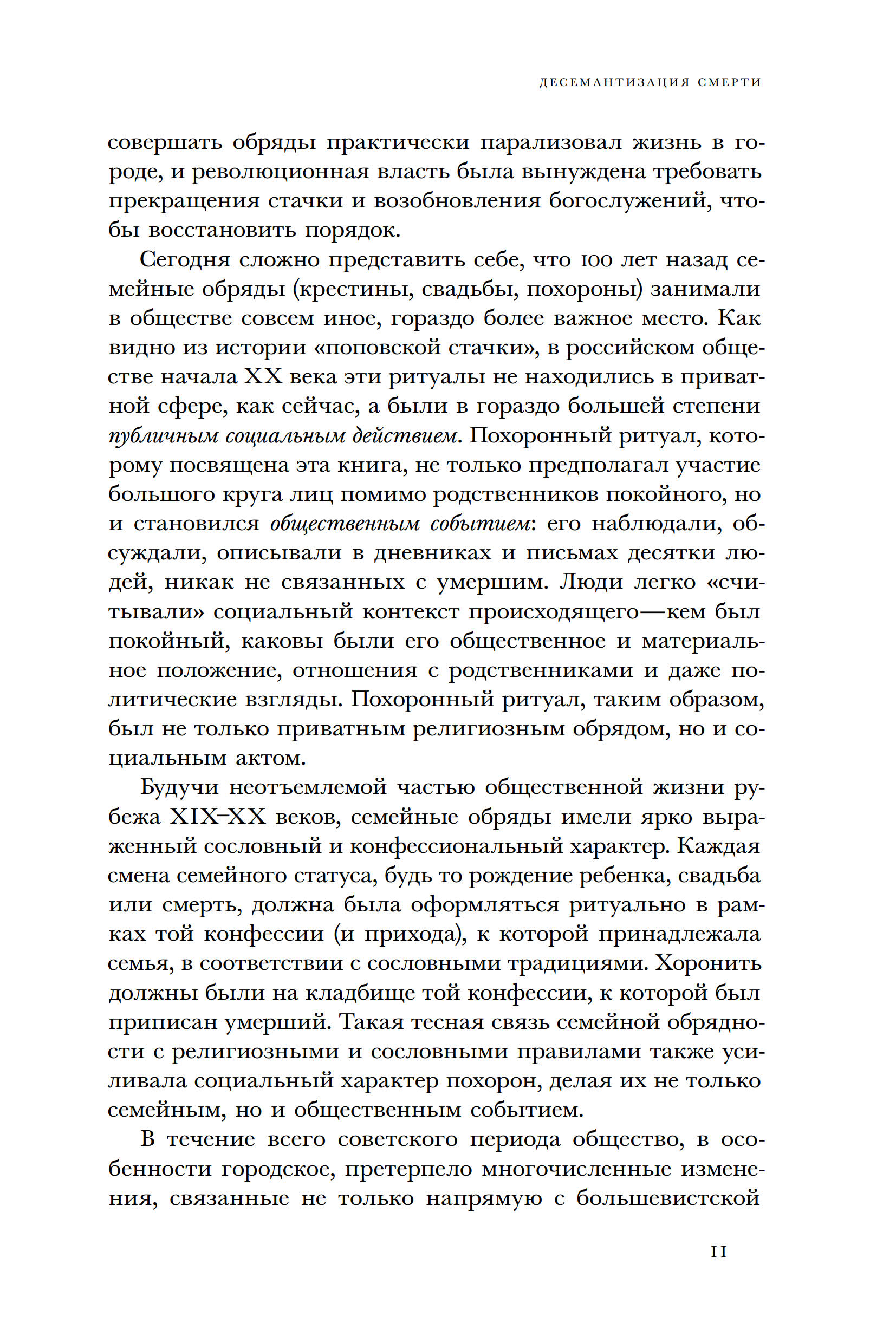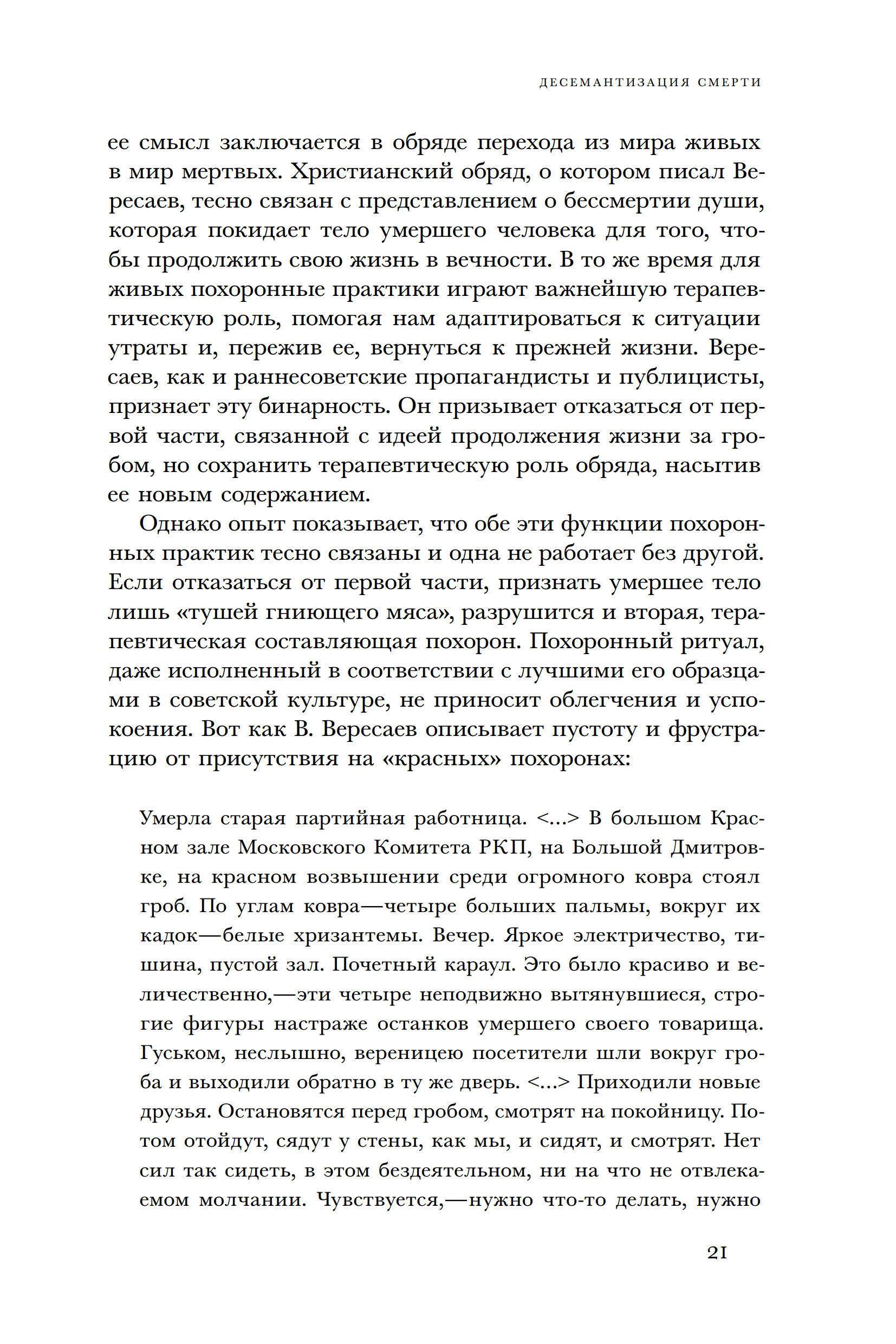 История СССР часто измеряется десятками и сотнями миллионов трагических и насильственных смертей — от голода, репрессий, войн, а также катастрофических издержек социальной и экономической политики советской власти. Но огромное число жертв советского эксперимента окружала еще более необъятная смерть: речь о миллионах и миллионах людей, умерших от старости, болезней и несчастных случаев. Книга историка и антрополога Анны Соколовой представляет собой анализ государственной политики в отношении смерти и погребения, а также причудливых метаморфоз похоронной культуры в крупных городах СССР. Эта тема долгое время оставалась в тени исследований о политических репрессиях и войнах, а также работ по традиционной деревенской похоронной культуре. Если эти аспекты советской мортальности исследованы неплохо, то вопрос о том, что представляли собой в материальном и символическом измерениях смерть и похороны рядового советского горожанина, изучен мало. Между тем он очень важен для понимания того, кем был (или должен был стать) «новый советский человек», провозглашенный революцией. Анализ трансформаций в сфере похоронной культуры проливает свет и на другой вопрос: был ли опыт радикального реформирования общества в СССР абсолютно уникальным или же, несмотря на весь свой радикализм, он был частью масштабного модернизационного перехода к индустриальным обществам?