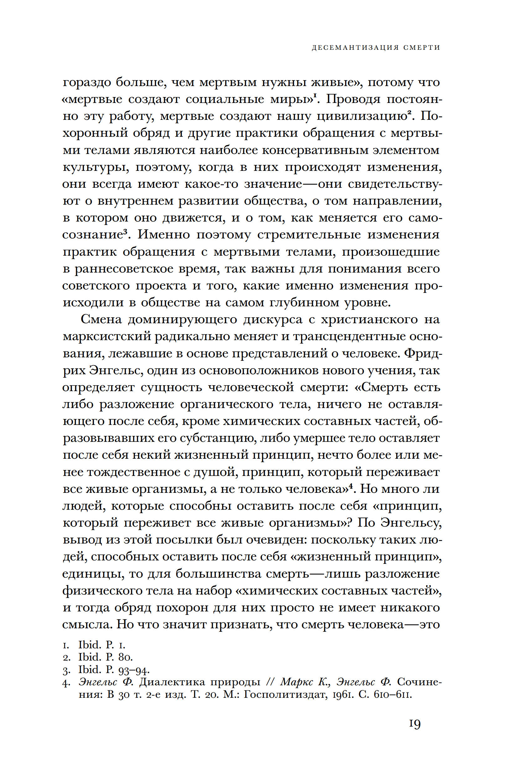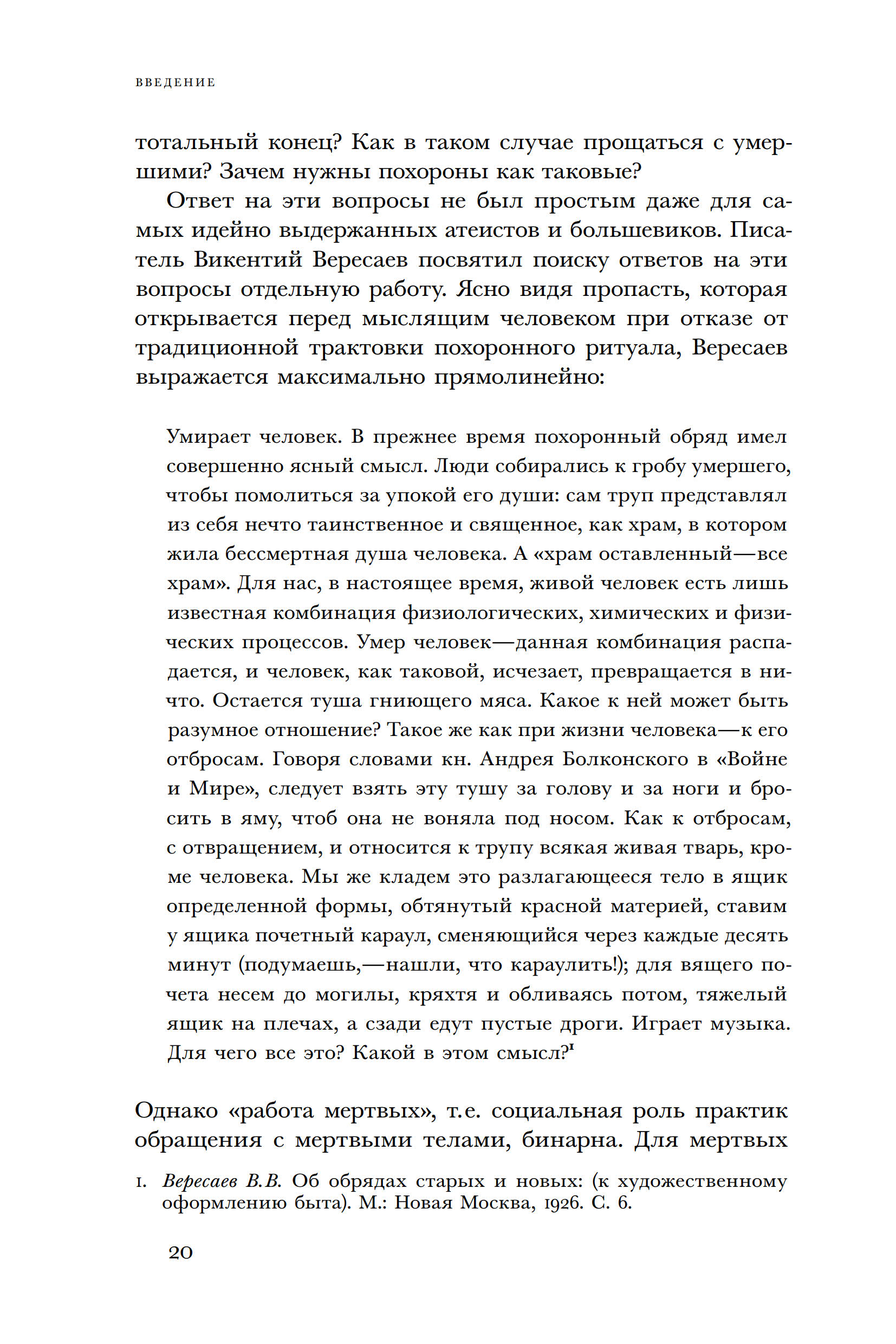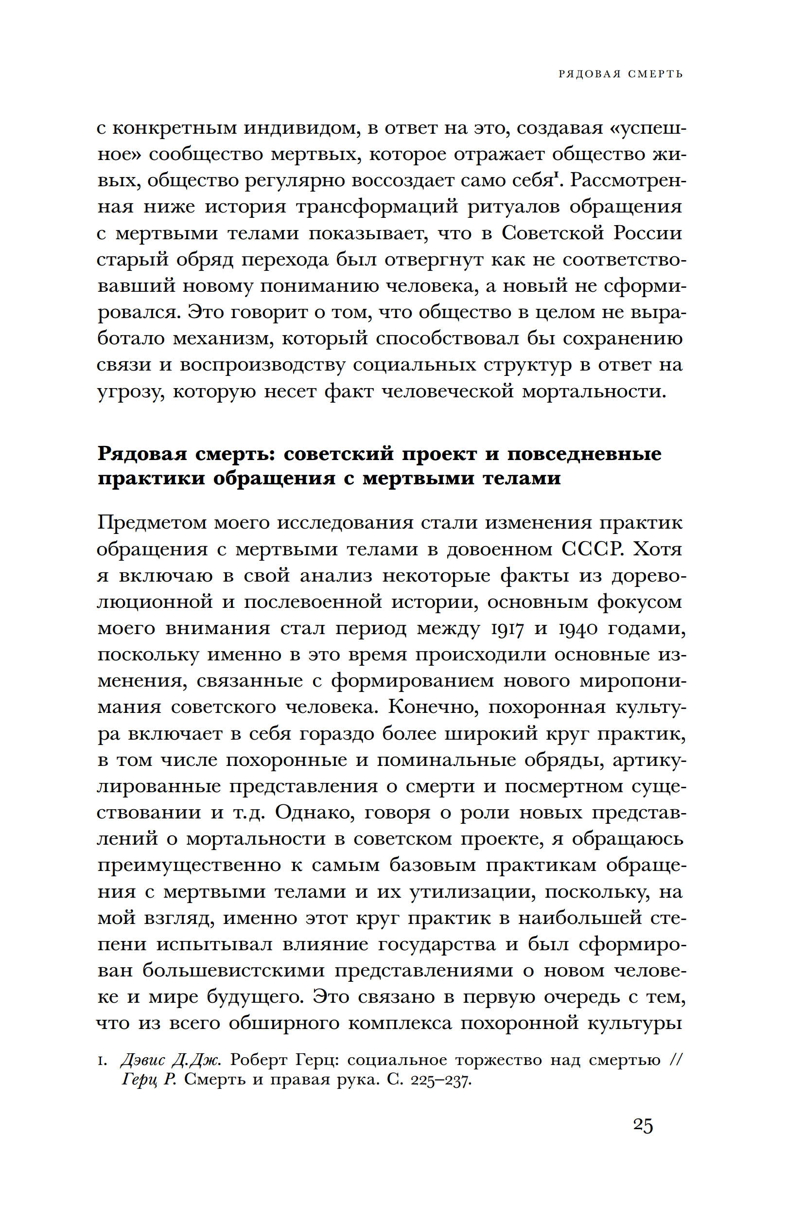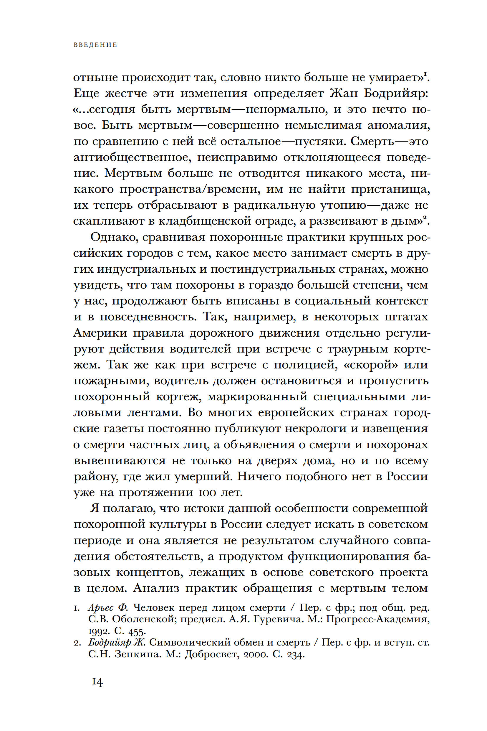История СССР часто измеряется десятками и сотнями миллионов трагических и насильственных смертей — от голода, репрессий, войн, а также катастрофических издержек социальной и экономической политики советской власти. Но огромное число жертв советского эксперимента окружала еще более необъятная смерть: речь о миллионах и миллионах людей, умерших от старости, болезней и несчастных случаев. Книга историка и антрополога Анны Соколовой представляет собой анализ государственной политики в отношении смерти и погребения, а также причудливых метаморфоз похоронной культуры в крупных городах СССР. Эта тема долгое время оставалась в тени исследований о политических репрессиях и войнах, а также работ по традиционной деревенской похоронной культуре. Если эти аспекты советской мортальности исследованы неплохо, то вопрос о том, что представляли собой в материальном и символическом измерениях смерть и похороны рядового советского горожанина, изучен мало. Между тем он очень важен для понимания того, кем был (или должен был стать) «новый советский человек», провозглашенный революцией. Анализ трансформаций в сфере похоронной культуры проливает свет и на другой вопрос: был ли опыт радикального реформирования общества в СССР абсолютно уникальным или же, несмотря на весь свой радикализм, он был частью масштабного модернизационного перехода к индустриальным обществам?