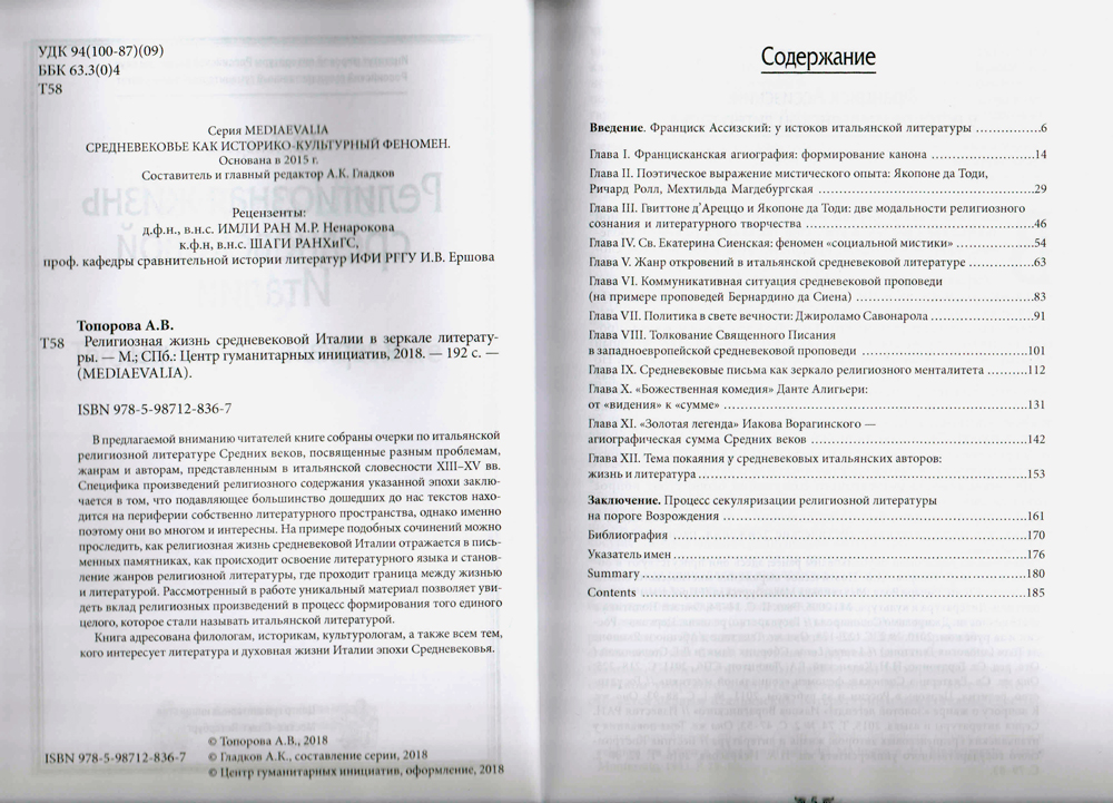 В предлагаемой вниманию читателей книге собраны очерки по итальянской религиозной литературе Средних веков, посвященные разным проблемам, жанрам и авторам, представленным в итальянской словесности XIII-XV вв. Специфика произведений религиозного содержания указанной эпохи заключается в том, что подавляющее большинство дошедших до нас текстов находится на периферии собственно литературного пространства, однако именно поэтому они во многом и интересны.