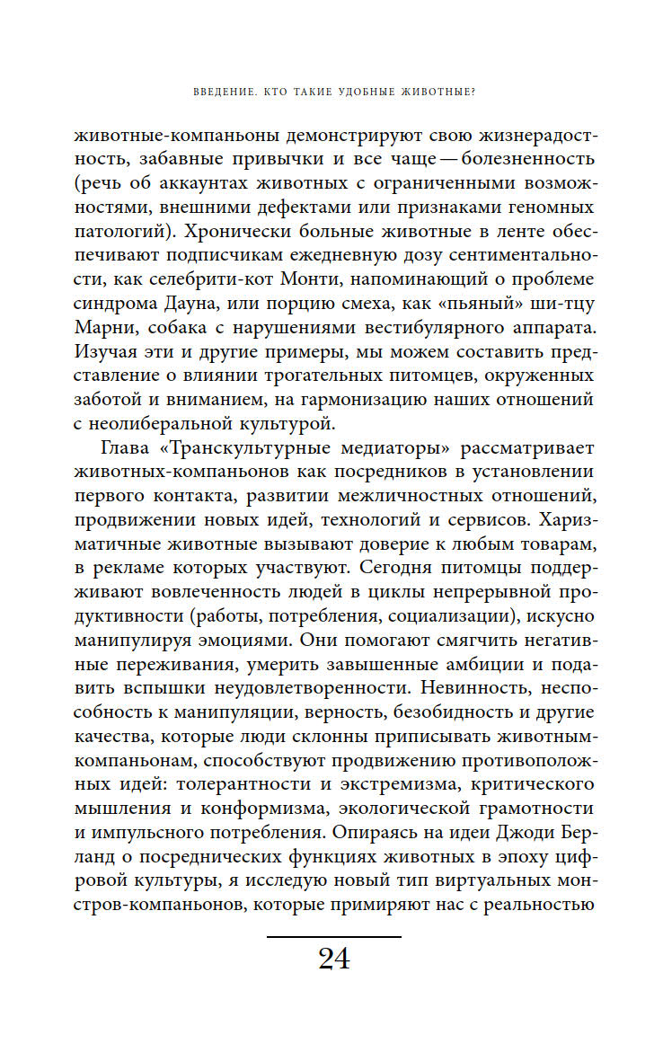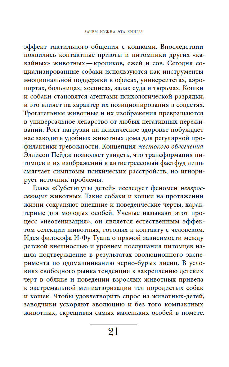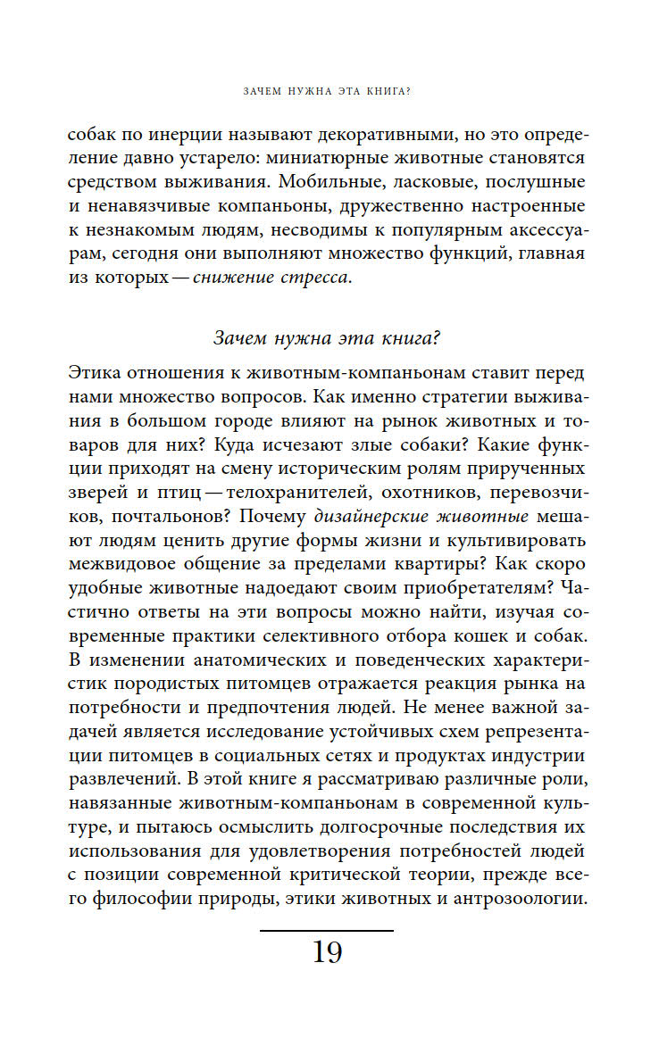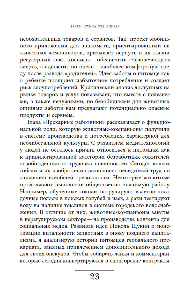 Ответы на эти вопросы автор ищет, осмысляя роли, навязанные животным в современной культуре, и прогнозируя последствия, которые может иметь такая динамика отношений между животными и людьми.