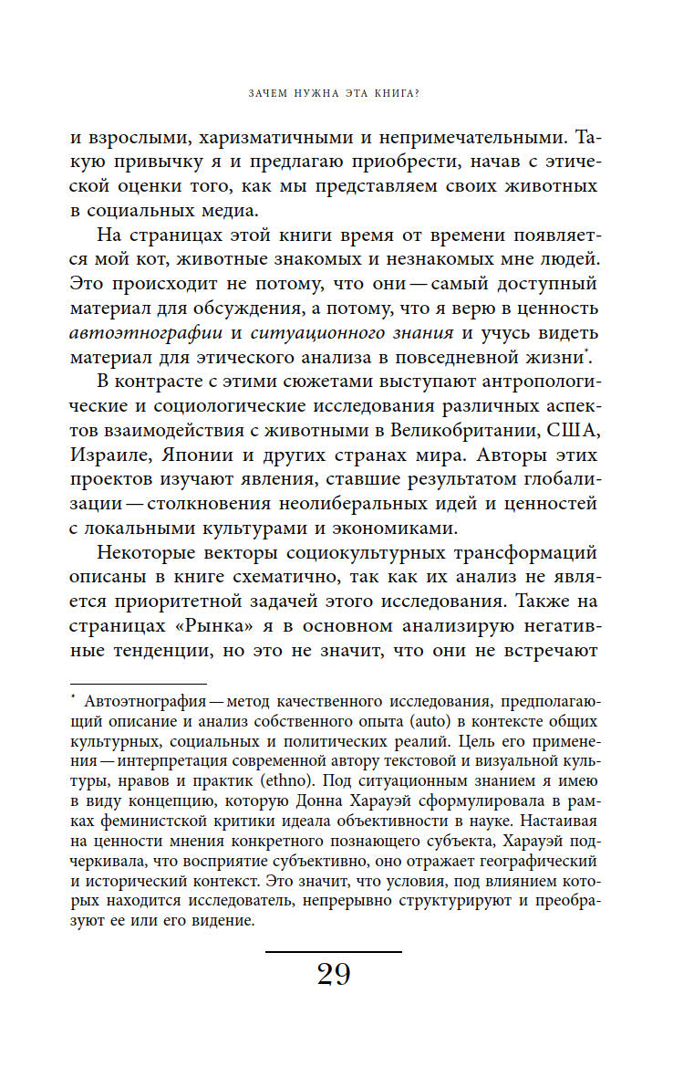 Книга написана на стыке антропологии, зоологии, культурологии и этики; автор активно привлекает новейшие данные в диапазоне от академических штудий до статистики соцсетей.