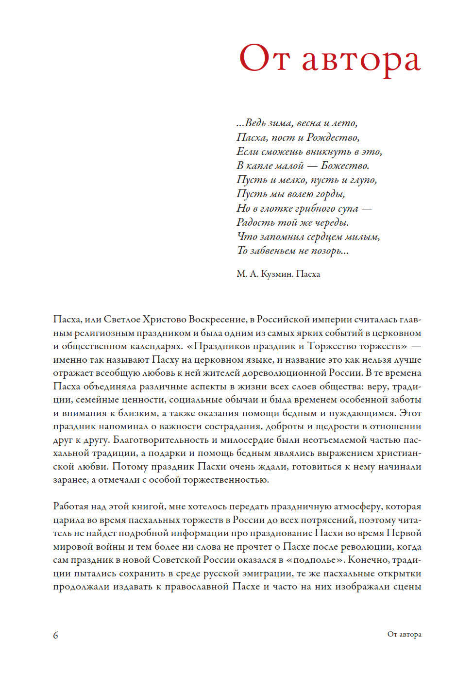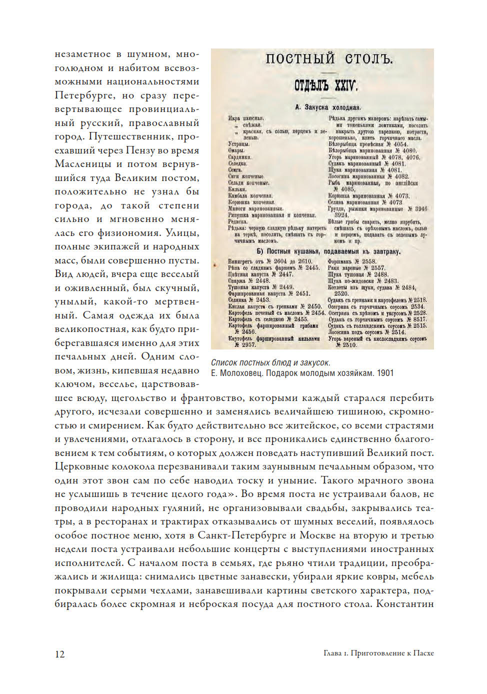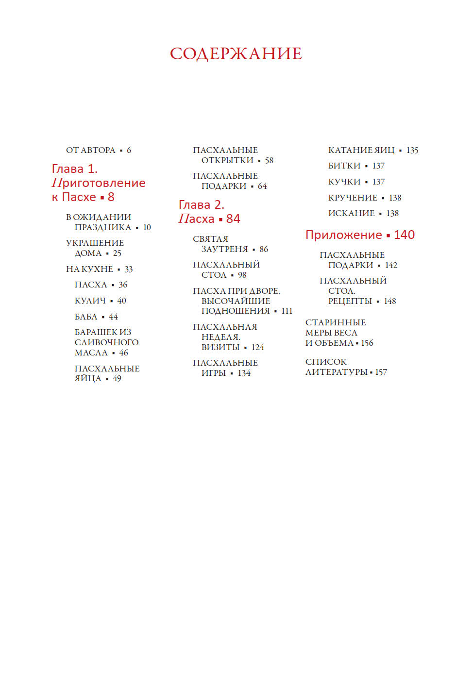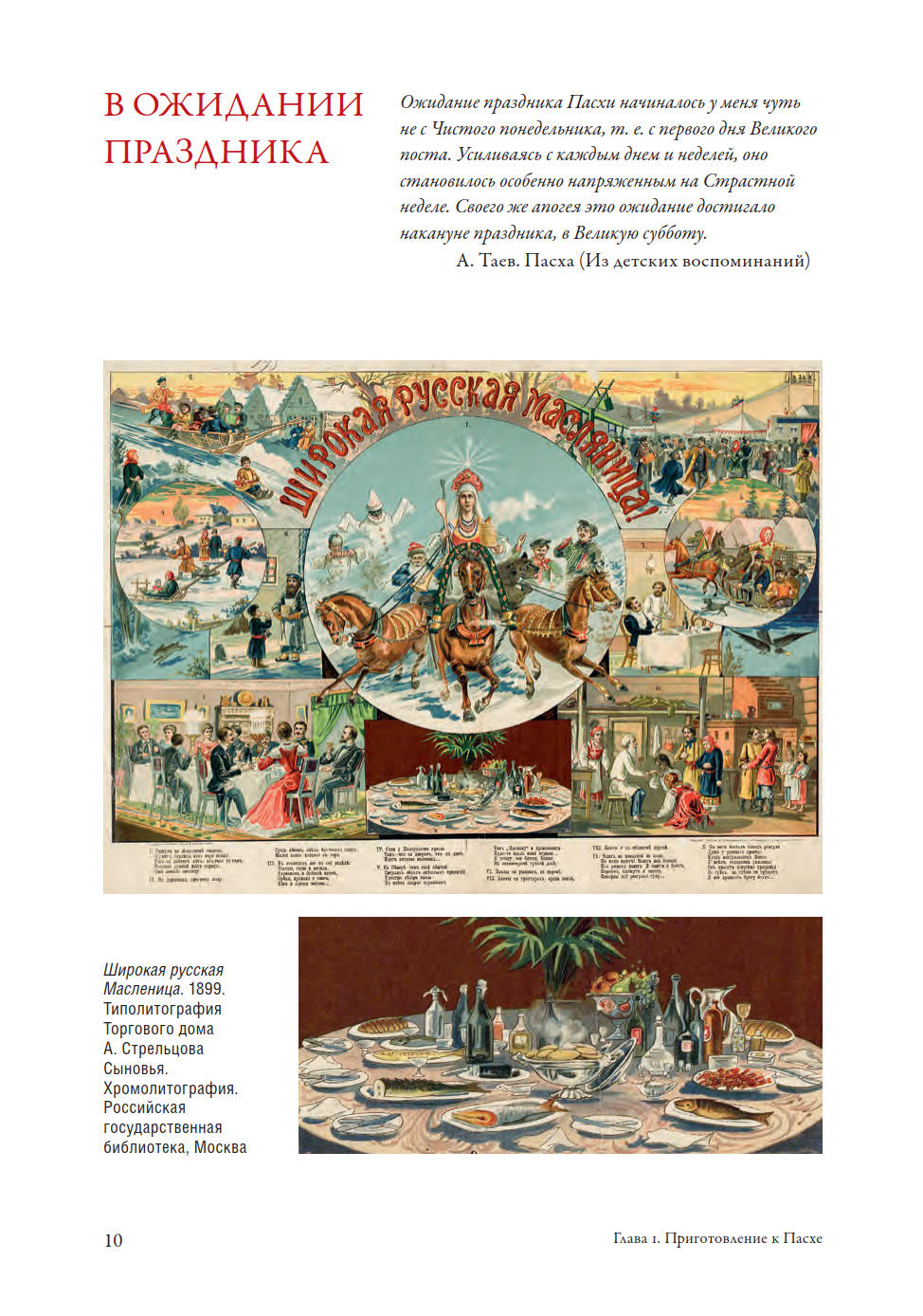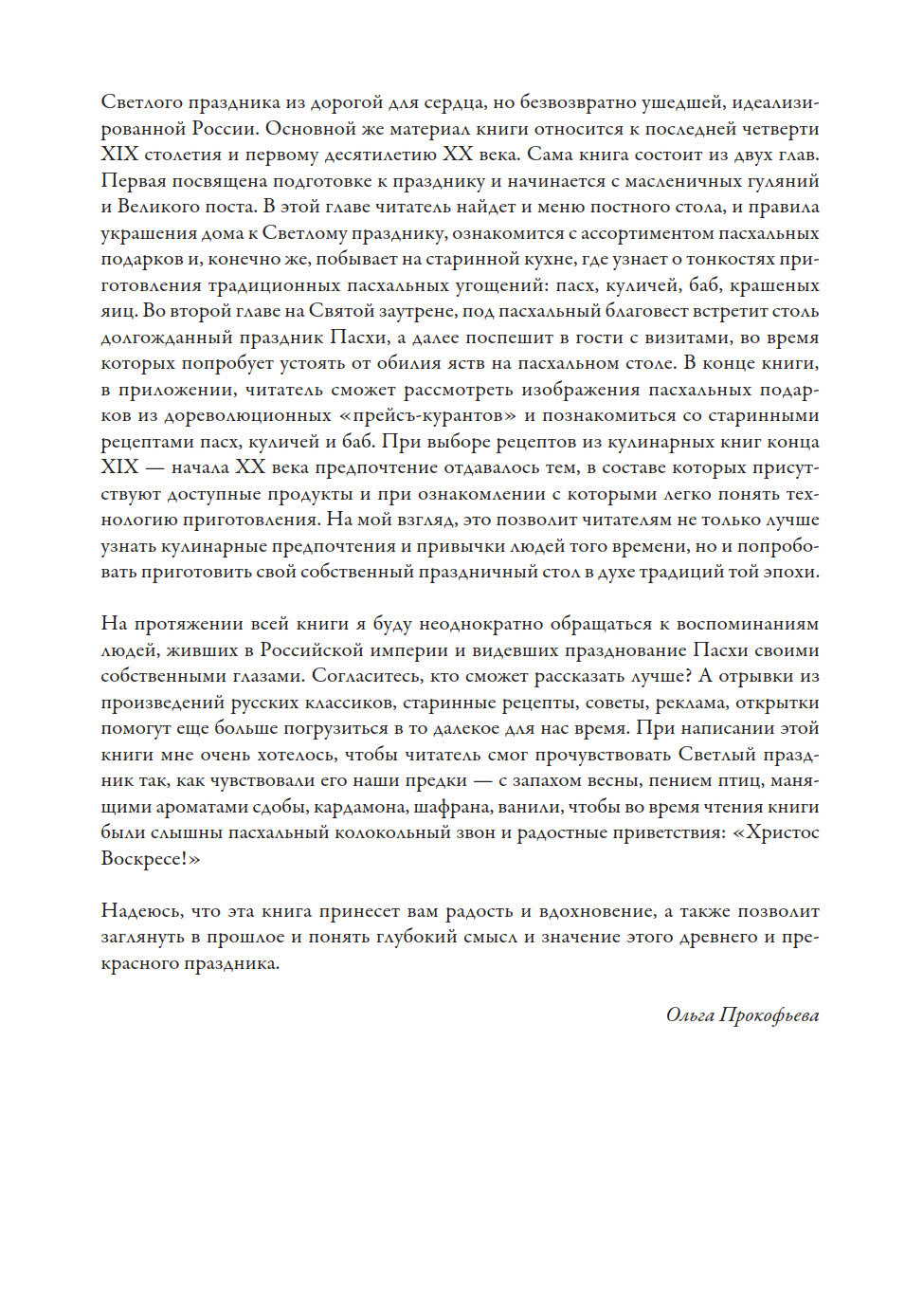 Книга Ольги Прокофьевой исследует историю празднования Пасхи в Российской империи, сосредотачиваясь на периоде с последней четверти XIX до первого десятилетия XX века. В первой части автор рассматривает подготовку к празднику, начиная с традиционных масленичных гуляний и Великого поста. Здесь подробно описаны меню постного стола, обычаи украшения дома к Светлому Христову Воскресению, ассортимент пасхальных подарков и старинные рецепты традиционных угощений, таких как пасхи, куличи, бабы и крашеные яйца. Вторая часть книги посвящена Святой заутрене, пасхальным визитам и играм, а также описанию празднования Пасхи при императорском дворе и другим важным аспектам этого торжественного события.