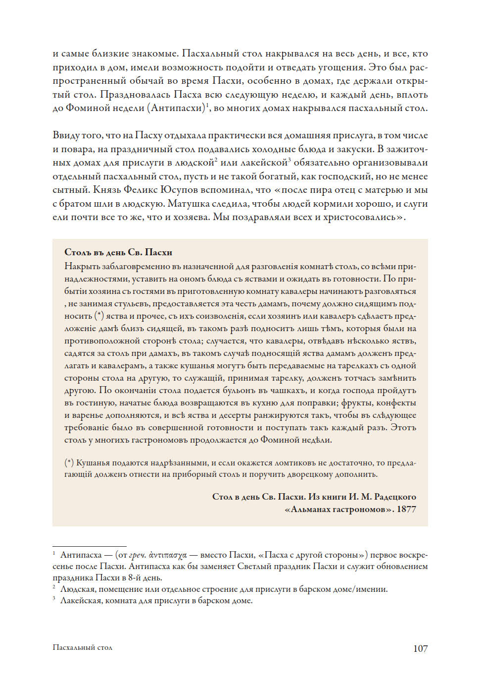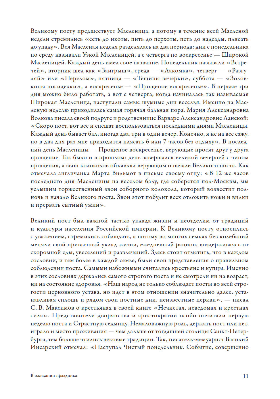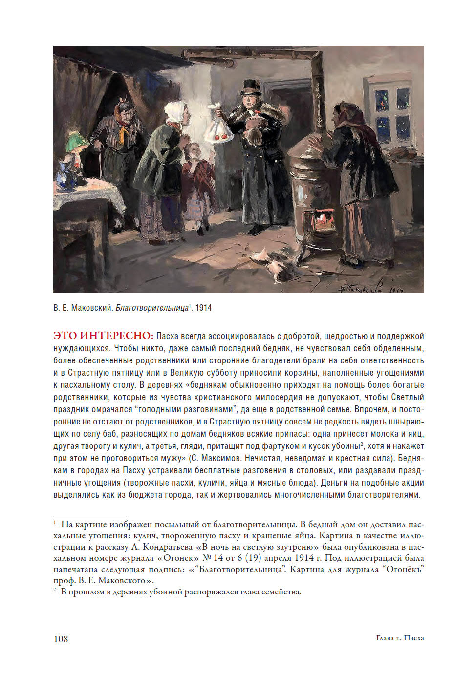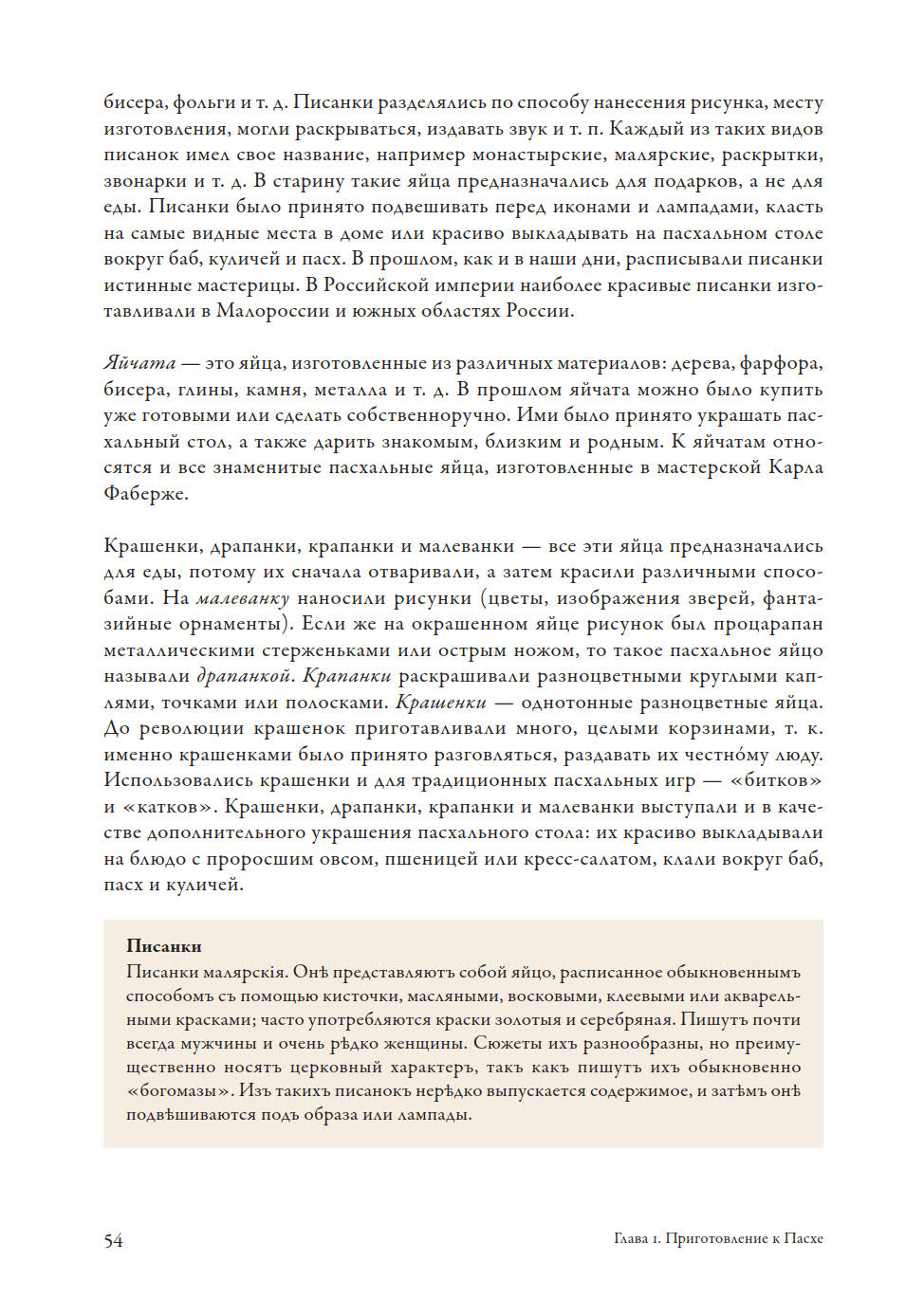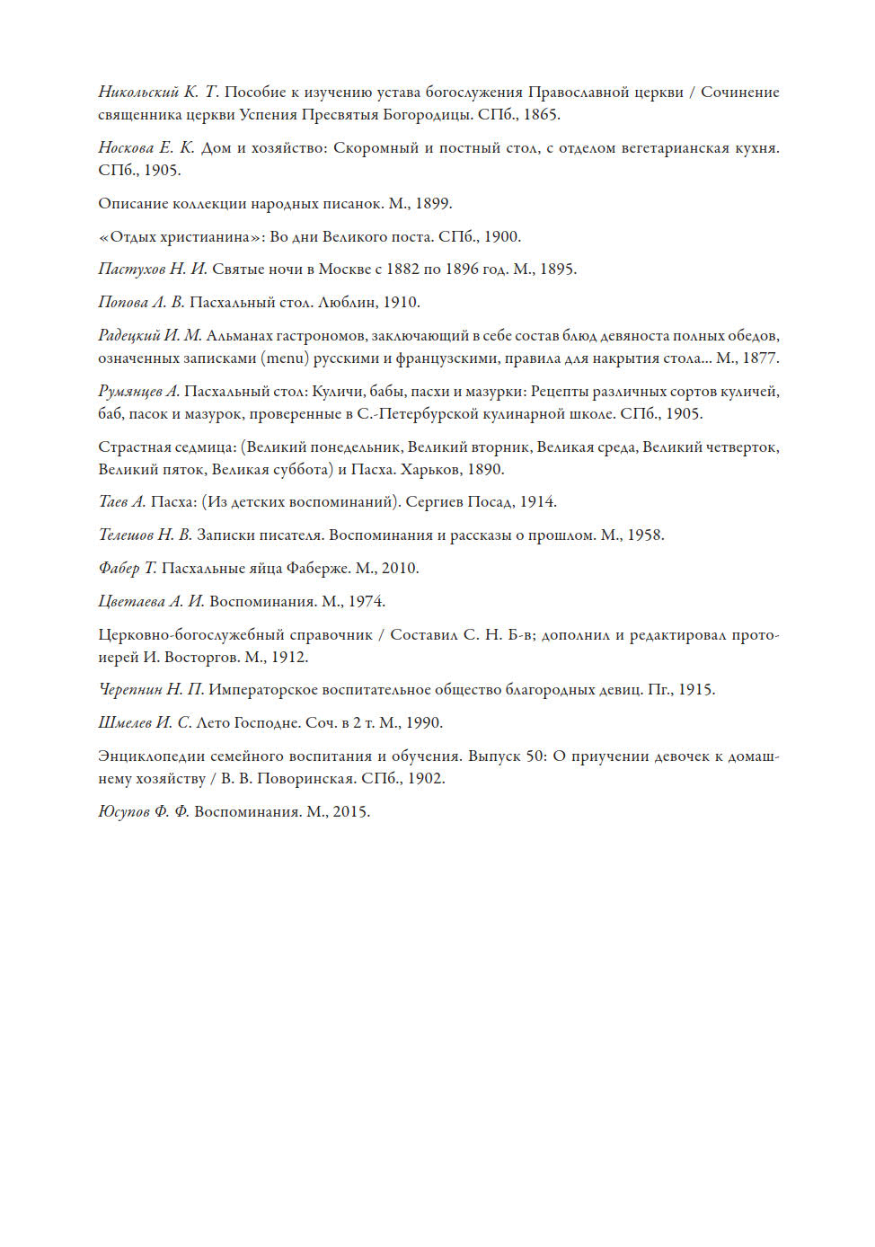 Книга Ольги Прокофьевой исследует историю празднования Пасхи в Российской империи, сосредотачиваясь на периоде с последней четверти XIX до первого десятилетия XX века. В первой части автор рассматривает подготовку к празднику, начиная с традиционных масленичных гуляний и Великого поста. Здесь подробно описаны меню постного стола, обычаи украшения дома к Светлому Христову Воскресению, ассортимент пасхальных подарков и старинные рецепты традиционных угощений, таких как пасхи, куличи, бабы и крашеные яйца. Вторая часть книги посвящена Святой заутрене, пасхальным визитам и играм, а также описанию празднования Пасхи при императорском дворе и другим важным аспектам этого торжественного события.