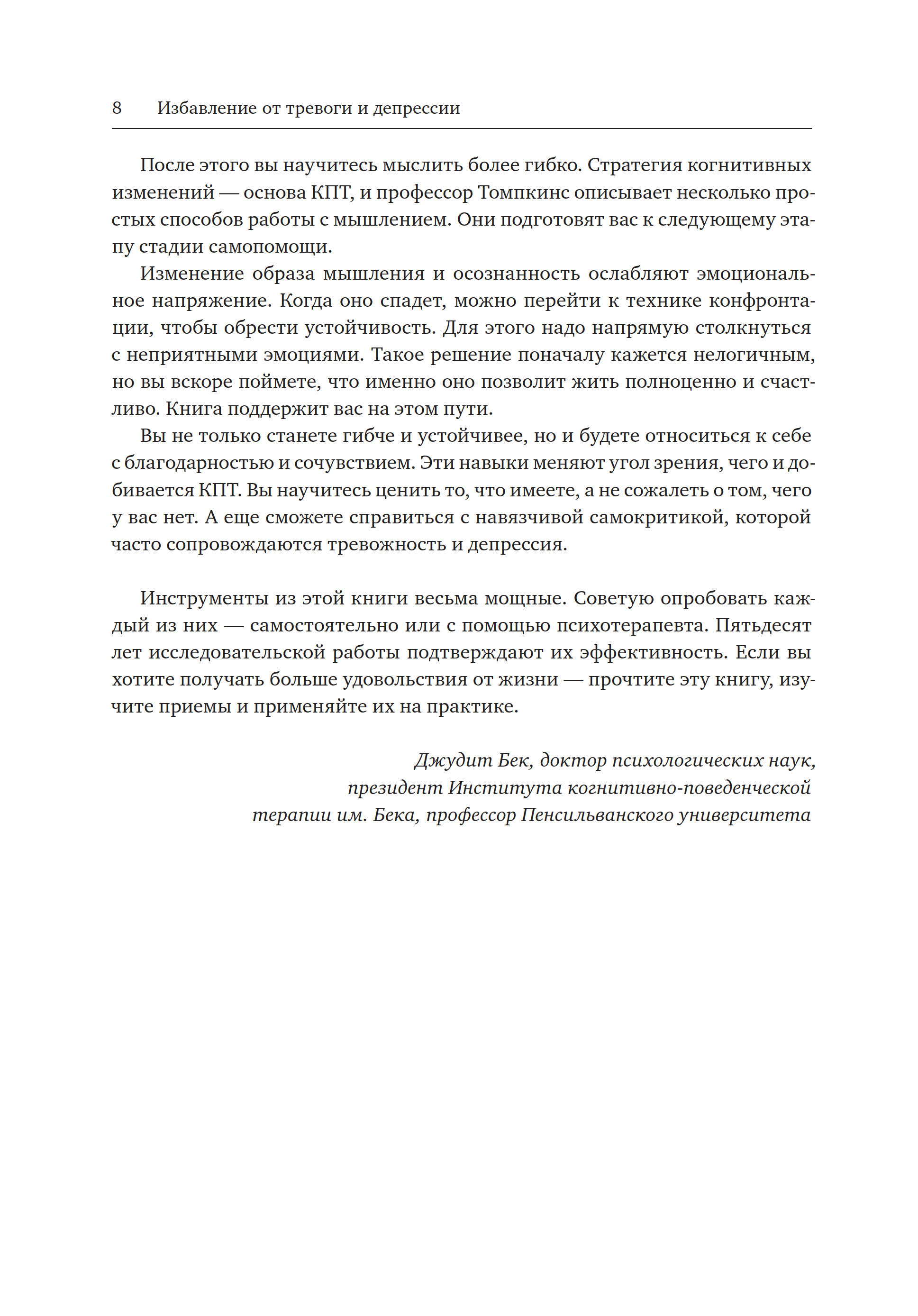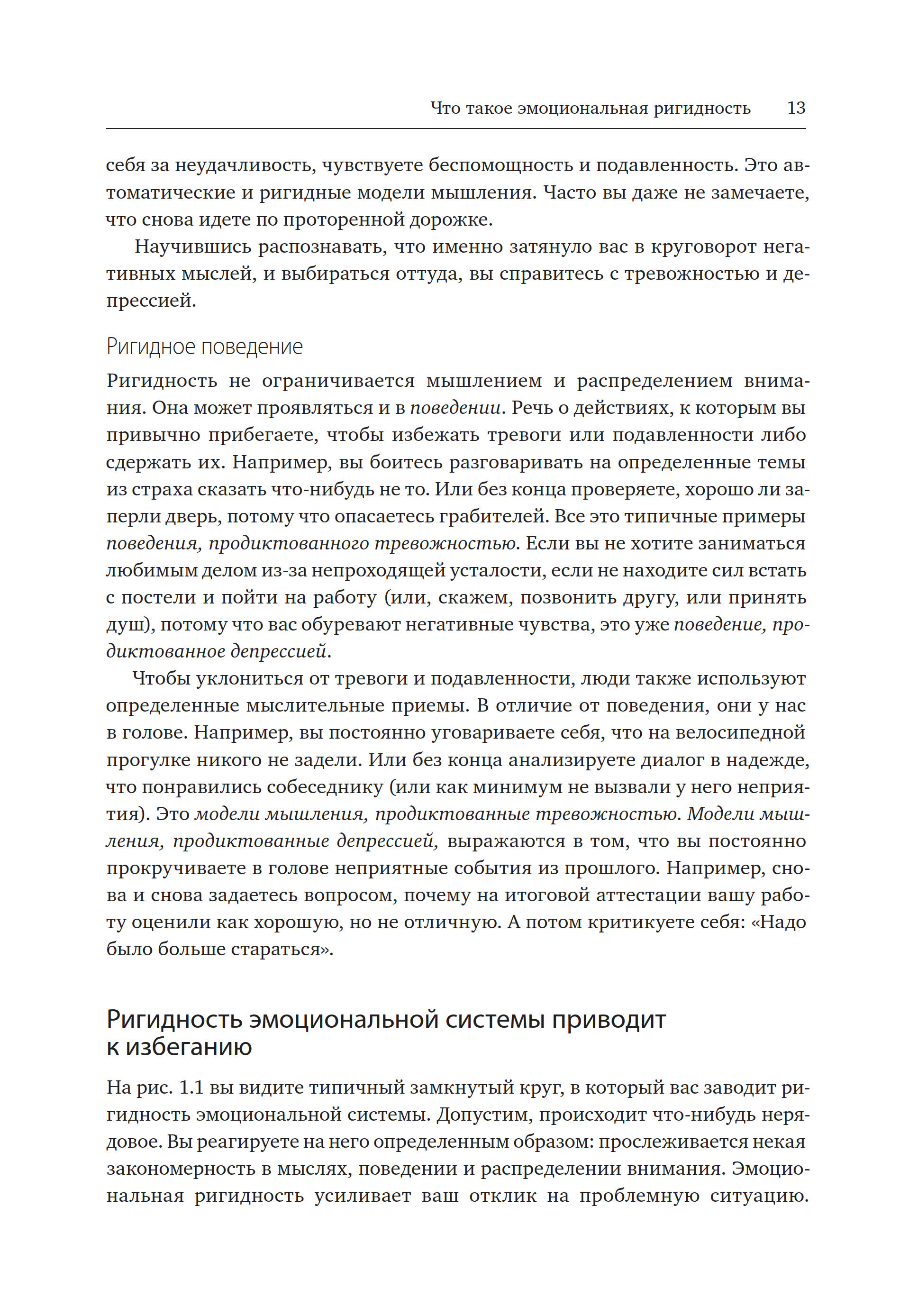 — Здесь представлены приемы — осознанность, гибкое мышление, самосострадание, — с которыми вы бы познакомились и на сеансах КПТ. КПТ — золотой стандарт в лечении тревожности и депрессии. Пятьдесят — и даже больше — лет исследований подтверждают: эти навыки помогают справиться с неприятными состояниями. Неважно, страдаете ли вы от тревоги, уныния, тревожного или депрессивного расстройства, — эта книга вам поможет. Одна книга, одна программа, один набор инструментов для ознакомления и применения. Ведь тревожность и депрессия — признаки ригидности эмоциональной системы.