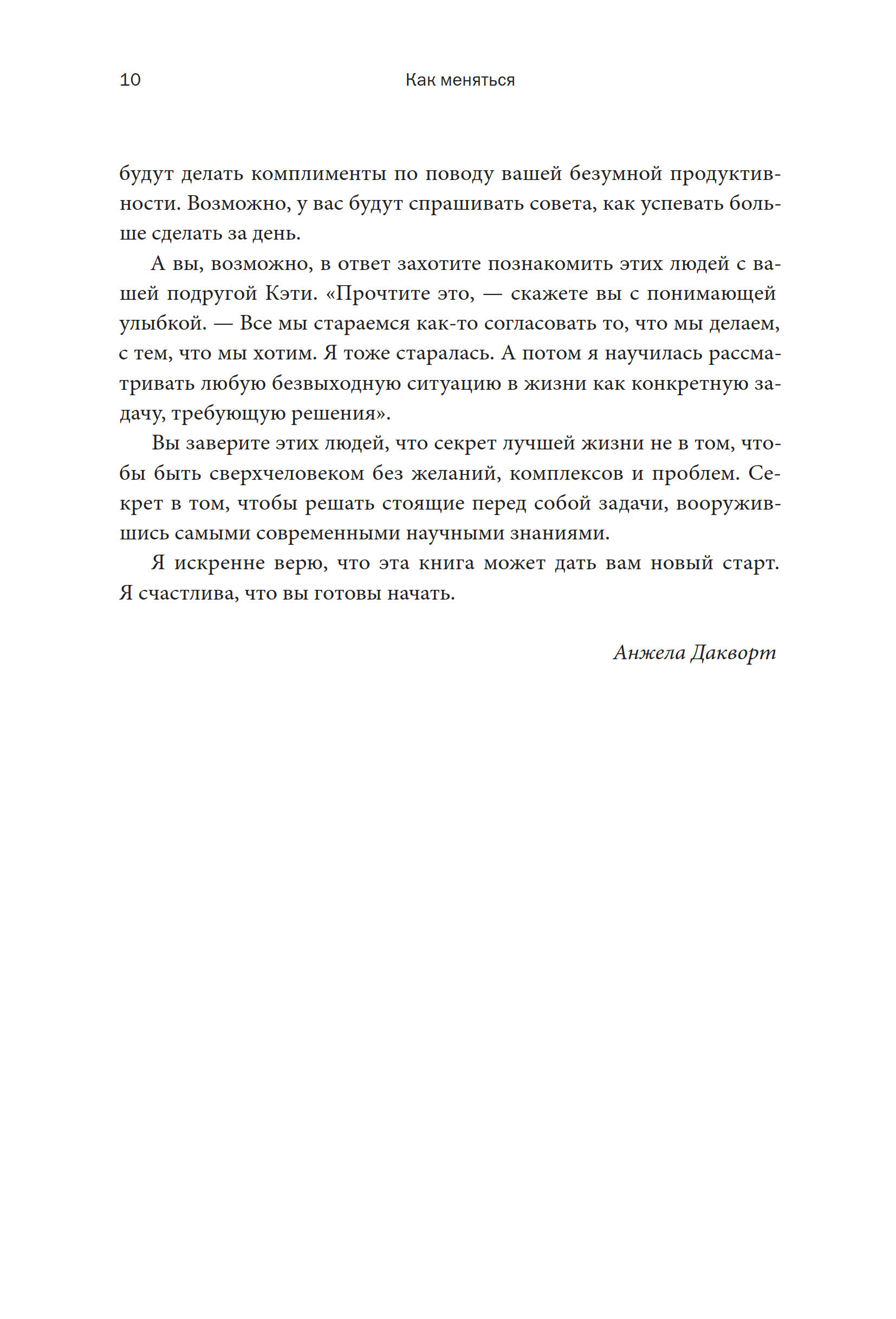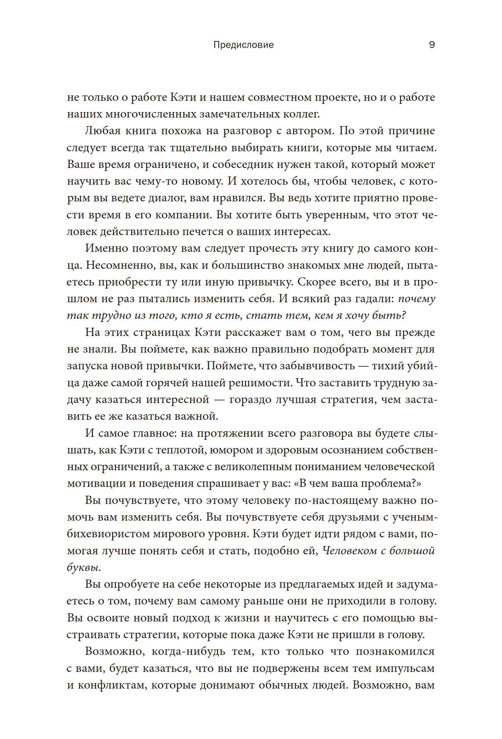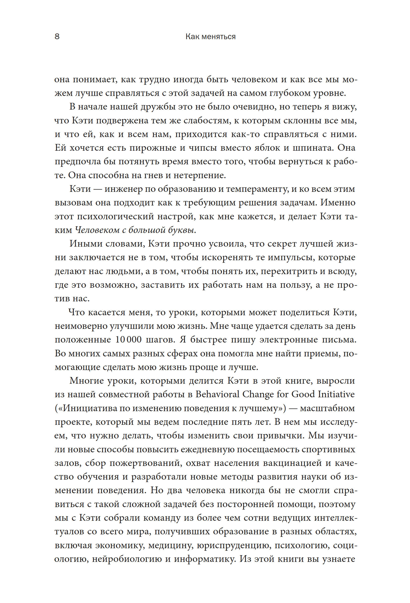 Мне повезло сотрудничать с десятками лучших мировых экономистов, психологов, программистов и врачей, разделивших мою цель разобраться в том, как можно менять поведение и тем самым улучшать жизнь. Наши коллективные исследования дали важные результаты, которые уже помогли университетам повысить успеваемость студентов, медикам — снизить число выписываемых без нужды антибиотиков, некоммерческим организациям — привлечь больше волонтеров, а работодателям — подстегнуть участие работников в льготных программах. Кроме того, мы нашли методики, способные помочь любому человеку быстро заложить привычку к спортивным занятиям, сделать свой рацион более полезным, увеличить сбережения или добраться до избирательного участка в день выборов.