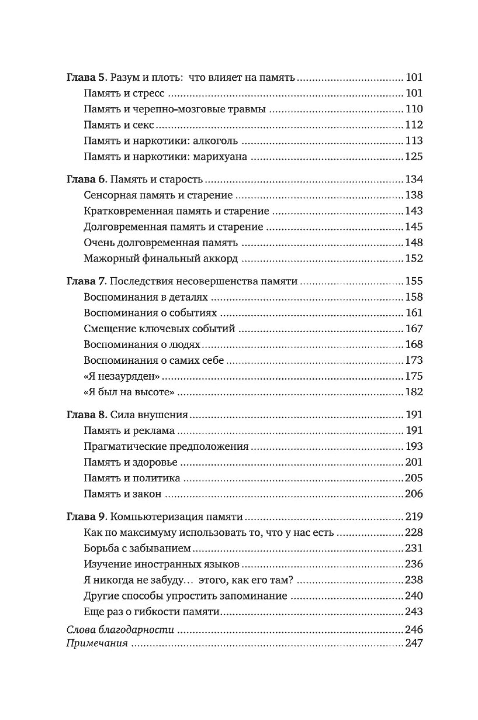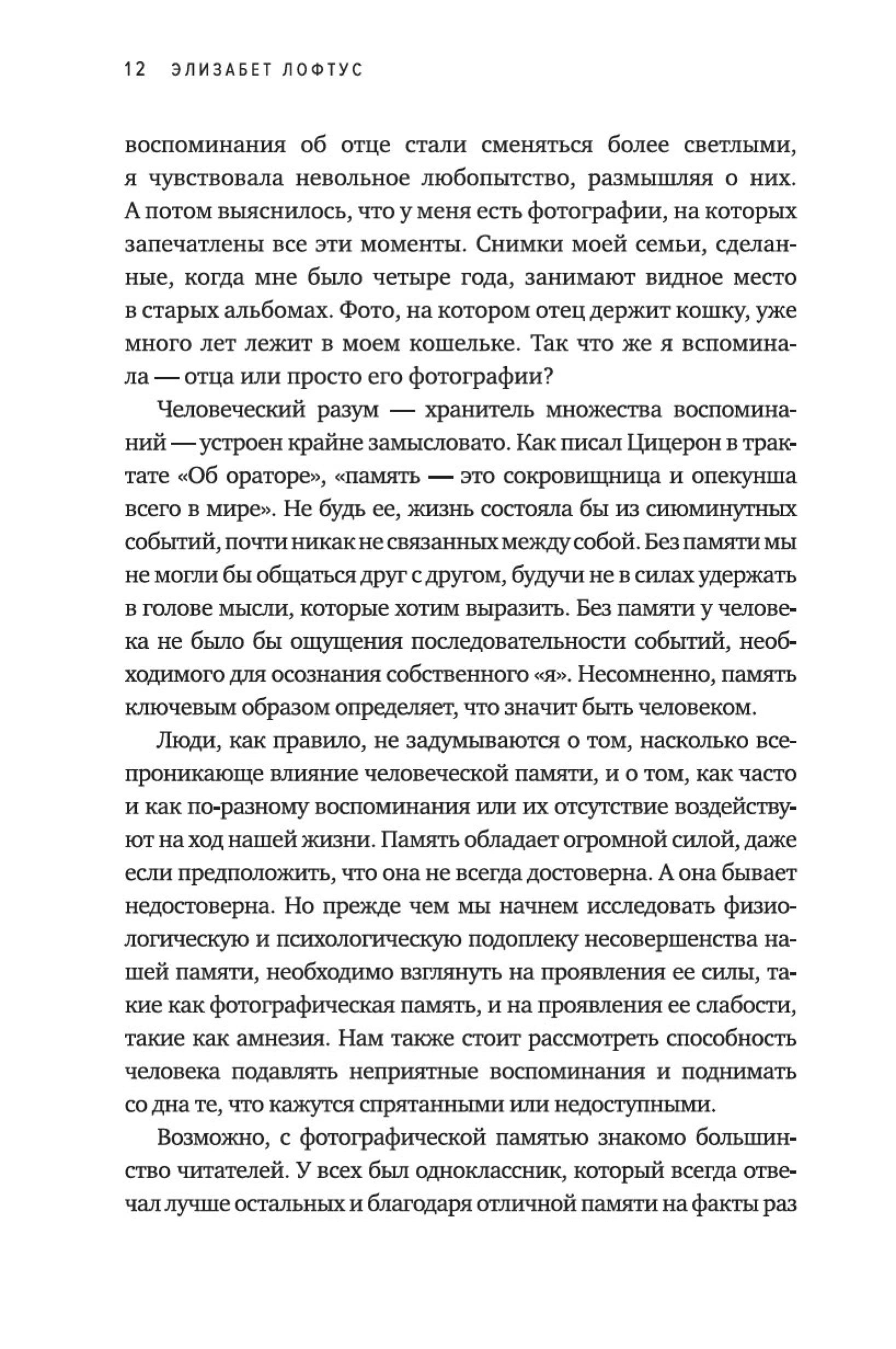 «Изменчивость человеческой памяти — это одновременно озадачивающее и досадное явление. Оно подразумевает, что наше прошлое, возможно, было вовсе не таким, каким мы его помним. Оно подрывает саму основу правды и уверенности в том, что нам известно. Нам удобнее думать, что где-то в нашем мозге лежат по-настоящему верные воспоминания, как бы глубоко они ни были спрятаны, и что они полностью соответствуют происходившим с нами событиям. К сожалению, правда состоит в том, что мы устроены иначе...»