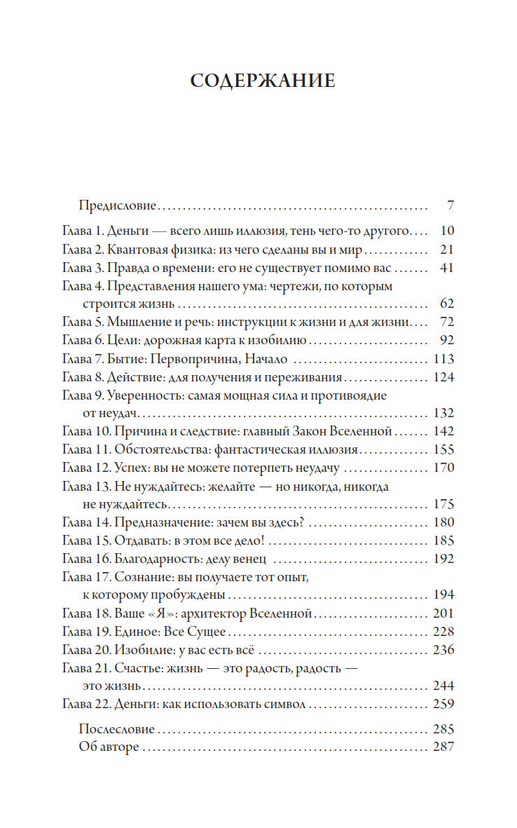 В ней говорится о деньгах и квантовой физике, о разумной Вселенной и значении медитации в нашей жизни. Также в книге затрагиваются темы щедрости, благодарности, осознанности и иллюзорности времени.