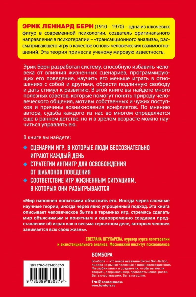 Перед вами одна из культовых книг по психологии человеческих взаимоотношений. Эрик Берн разработал систему, способную избавить человека от влияния жизненных сценариев, программирующих его поведение, научить его меньше играть в отношениях с собой и другими, обрести подлинную свободу и побудить к личностному росту. В этой книге вы найдете много полезных советов, которые помогут понять природу человеческого общения, мотивы собственных и чужих поступков и причины возникновения конфликтов.