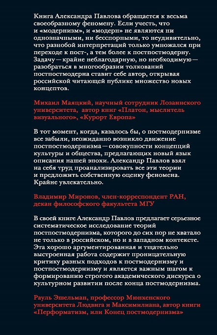 На протяжении двух десятилетий в конце ХХ века социальные теоретики, философы, литературоведы, искусствоведы и т. д. спорили о том, что такое постмодернизм. Однако уже в начале XXI столетия почти все теоретики «постмодернизма» отказались от этого термина. Постмодерн как язык описания эпохи уступил место чему-то другому, и разные авторы стали предлагать собственные концепции новой культурной логики. Этот универсум теорий получил название «постпостмодернизм». После краткого введения в проблему постмодерна автор обращается ко всем этим концепциям разных масштабов и разной популярности — гипермодернизму, постгуманизму, сверхмодернизму, трансмодернизму, неомодернизму, альтермодернизму, перформатизму, реновализму, космодернизму, метамодернизму, автомодернизму, диджимодернизму, реалистическому капитализму и т. д. Отдельно рассматриваются попытки художников и деятелей искусства упразднить постмодернизм за счет манифестов и арт-движений — стакизма, ремодернизма, интентизма, off-модернизма, группы художников-неомодернистов.