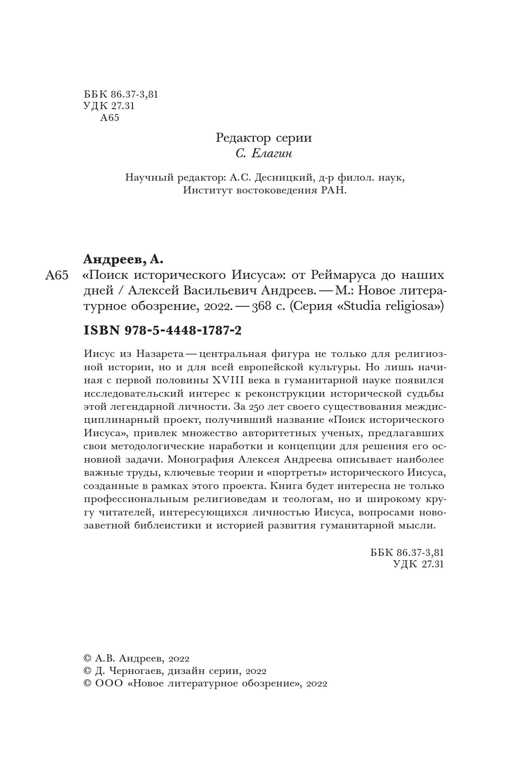 Иисус из Назарета — центральная фигура не только для религиозной истории, но и для всей европейской культуры. Но лишь начиная с первой половины XVIII века в гуманитарной науке появился исследовательский интерес к реконструкции исторической судьбы этой легендарной личности. За 250 лет своего существования междисциплинарный проект, получивший название «Поиск исторического Иисуса», привлек множество авторитетных ученых, предлагавших свои методологические наработки и концепции для решения его основной задачи. Монография Алексея Андреева описывает наиболее важные труды, ключевые теории и «портреты» исторического Иисуса, созданные в рамках этого проекта. Книга будет интересна не только профессиональным религиоведам и теологам, но и широкому кругу читателей, интересующихся личностью Иисуса, вопросами новозаветной библеистики и историей развития гуманитарной мысли.